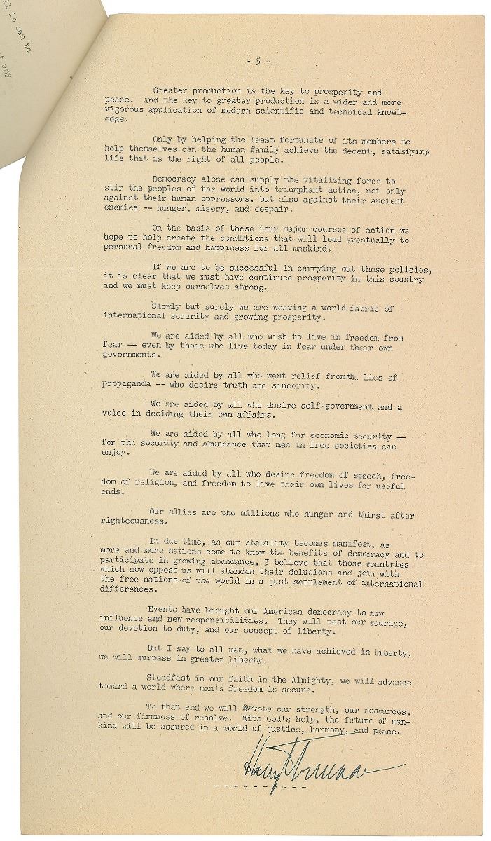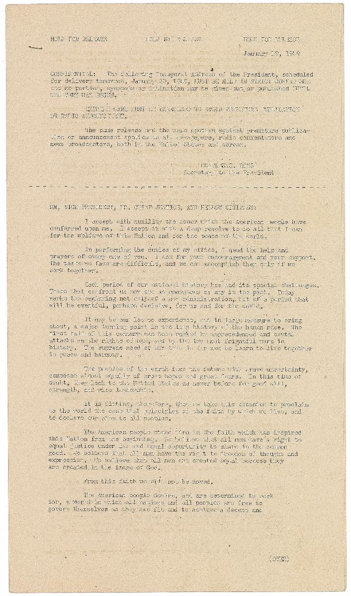 Press release, five pages on four sheets, 8 x 14, January 19, 1949. Mimeographed press release of Truman’s inaugural address. In part: “Mr. Vice President, Mr. Chief Justice, and Fellow Citizens: I accept with humility the honor which the American people have conferred upon me. I accept it with a deep resolve to do all that I can for the welfare of this Nation and for the peace of the world. In performing the duties of my office, I need the help and prayers of every one of you. I ask for your encouragement and your support. The tasks we face are difficult, and we can accomplish them only if we work together…First, we will continue to give unfaltering support to the United Nations and related agencies, and we will continue to search for ways to strengthen their authority and increase their effectiveness…Second, we will continue our programs for world economic recovery…Third, we will strengthen freedom-loving nations against the dangers of aggression…Fourth, we must embark on a bold new program for making the benefits of our scientific advances and industrial progress available for the improvement and growth of underdeveloped areas…Events have brought our American democracy to new influence and new responsibilities. They will test our courage, our devotion to duty, and our concept of liberty. But I say to all men, what we have achieved in liberty, we will surpass in greater liberty. Steadfast in our faith in the Almighty, we will advance toward a world where man’s freedom is secure. To that end we will devote our strength, our resources, and our firmness of resolve. With God’s help, the future of mankind will be assured in a world of justice, harmony, and peace.” Signed at the conclusion in fountain pen. In fine condition. Known as the ‘Four Point Speech,’ Truman outlines American values against the scourge of communism and calls for Democrats and Republicans alike to assist people around the world struggling for freedom and human rights. This speech is generally regarded as the beginning of international development policy in relation to the Third World.