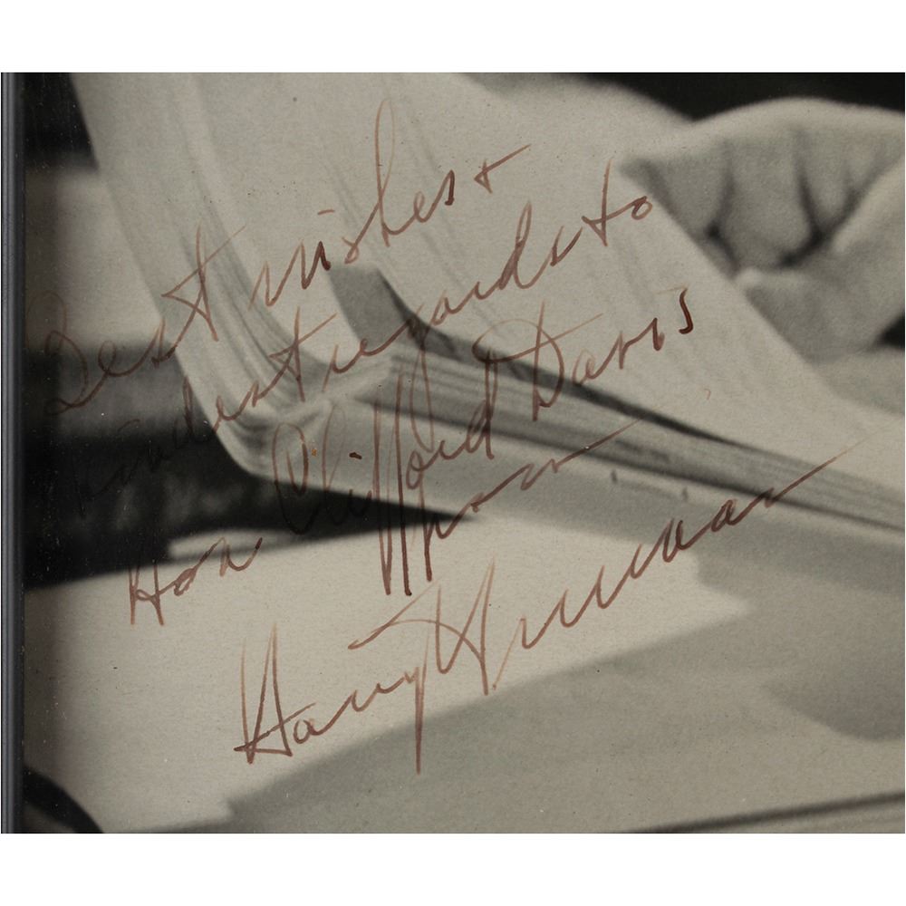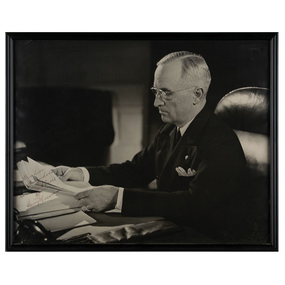 Impressive vintage matte-finish 19 x 15 photo of Truman seated and reading at his desk, signed and inscribed in fountain pen, "Best wishes & kindest regards to Hon. Clifford Davis, from Harry S. Truman.‰Û Framed to a slightly larger size. In fine condition.