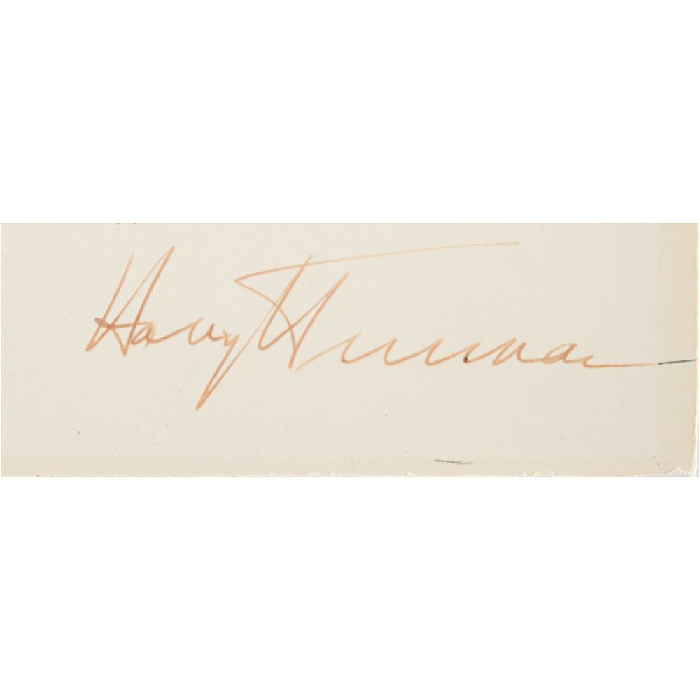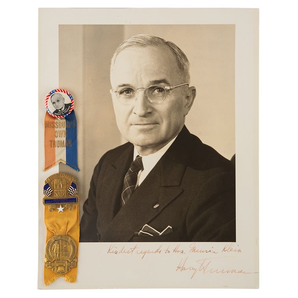 Handsome vintage matte-finish 9.5 x 12.25 photo of the 33rd American President, signed and inscribed in fountain pen, "Kindest regards to Hon. Maurice Klein, Harry S. Truman.” Affixed to a same-size mount. In fine condition, with trimmed edges. Accompanied by an "Honorary Ass't Vice President" from the 1948 Democratic National Convention in Philadelphia, and a campaign button with attached ribbon reading "Missouri's Own Truman."