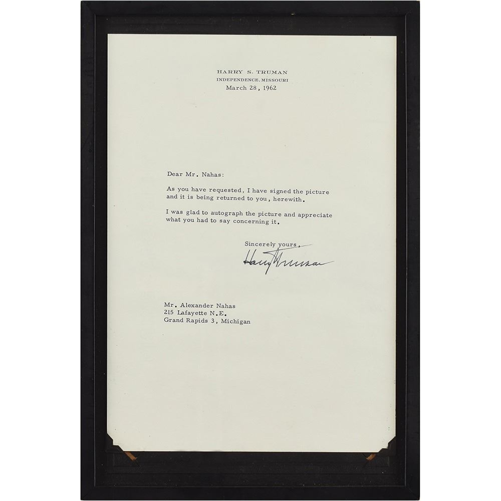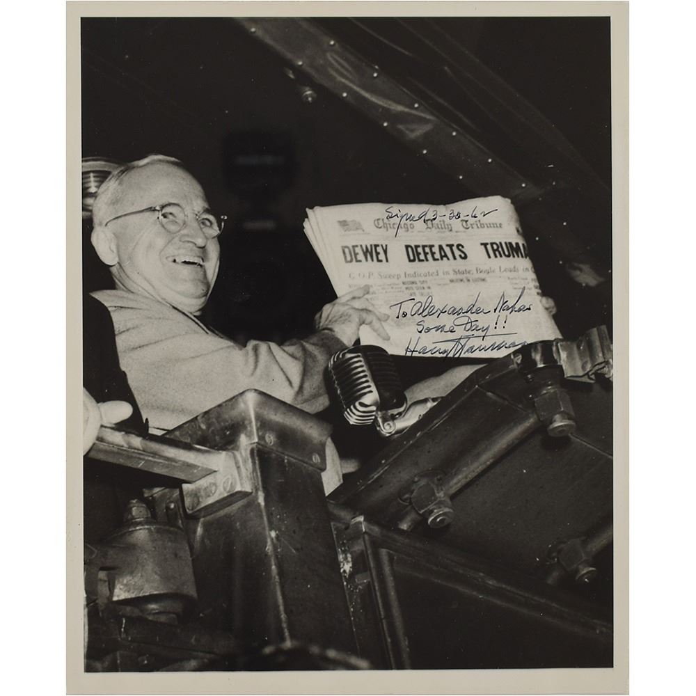 Vintage glossy 8 x 10 photo of Truman holding up the iconic 'Dewey Defeats Truman' issue of the Chicago Tribune, signed and inscribed on the newspaper in fountain pen, "To Alexander Nahas, Some day!! Harry S. Truman," who adds the date above, "Signed 3–30–62.†Reverse bears two Wide World Photo stamps and an affixed caption sheet dated November 5, 1948. Included with the photo is a TLS from Truman to Nahas, one page, 7.25 x 10.5, personal letterhead, March 28, 1962, in full: "As you have requested, I have signed the picture and it is being returned to you, herewith. I was glad to autograph the picture and appreciate what you had to say concerning it." The letter is framed to a slightly larger size. In overall fine condition.