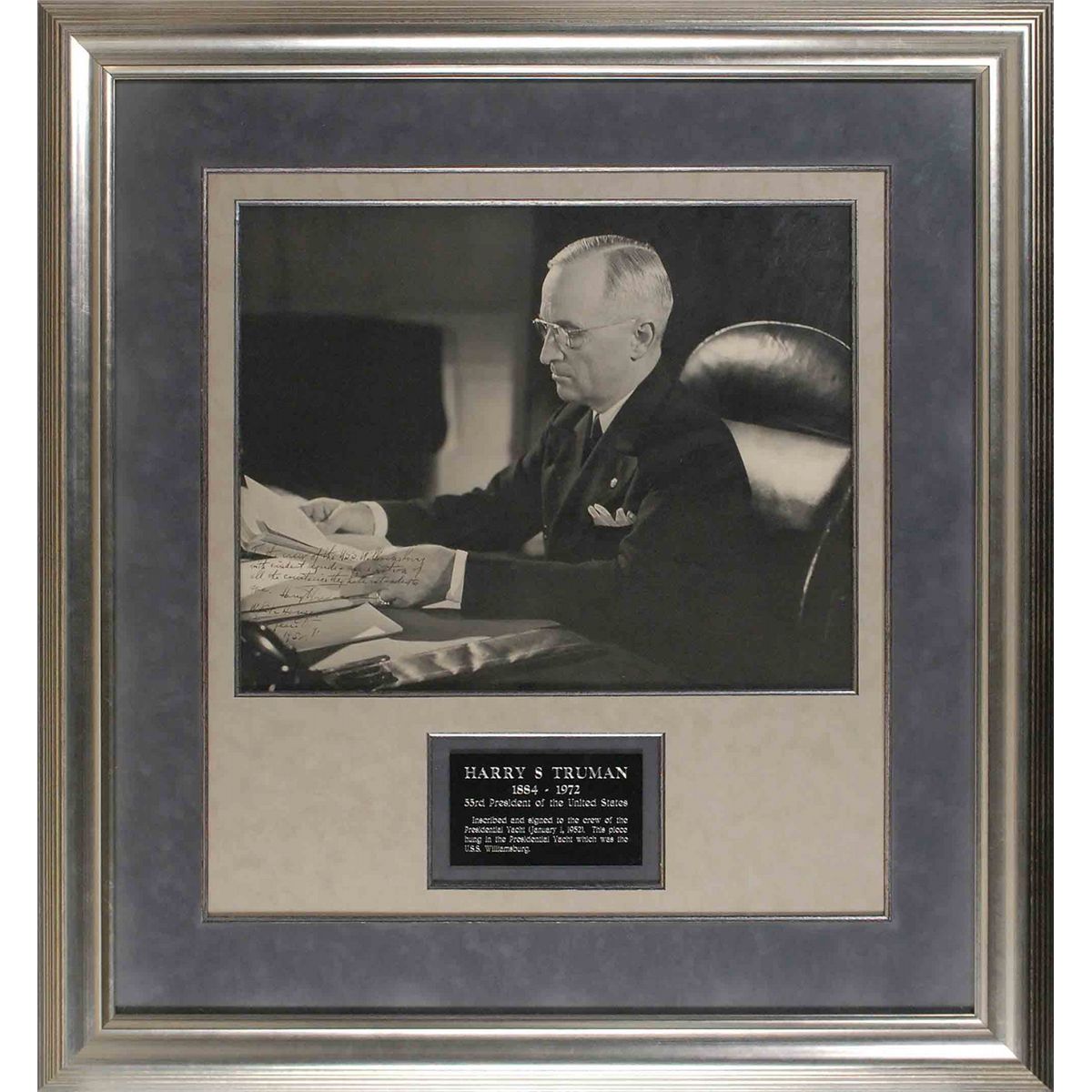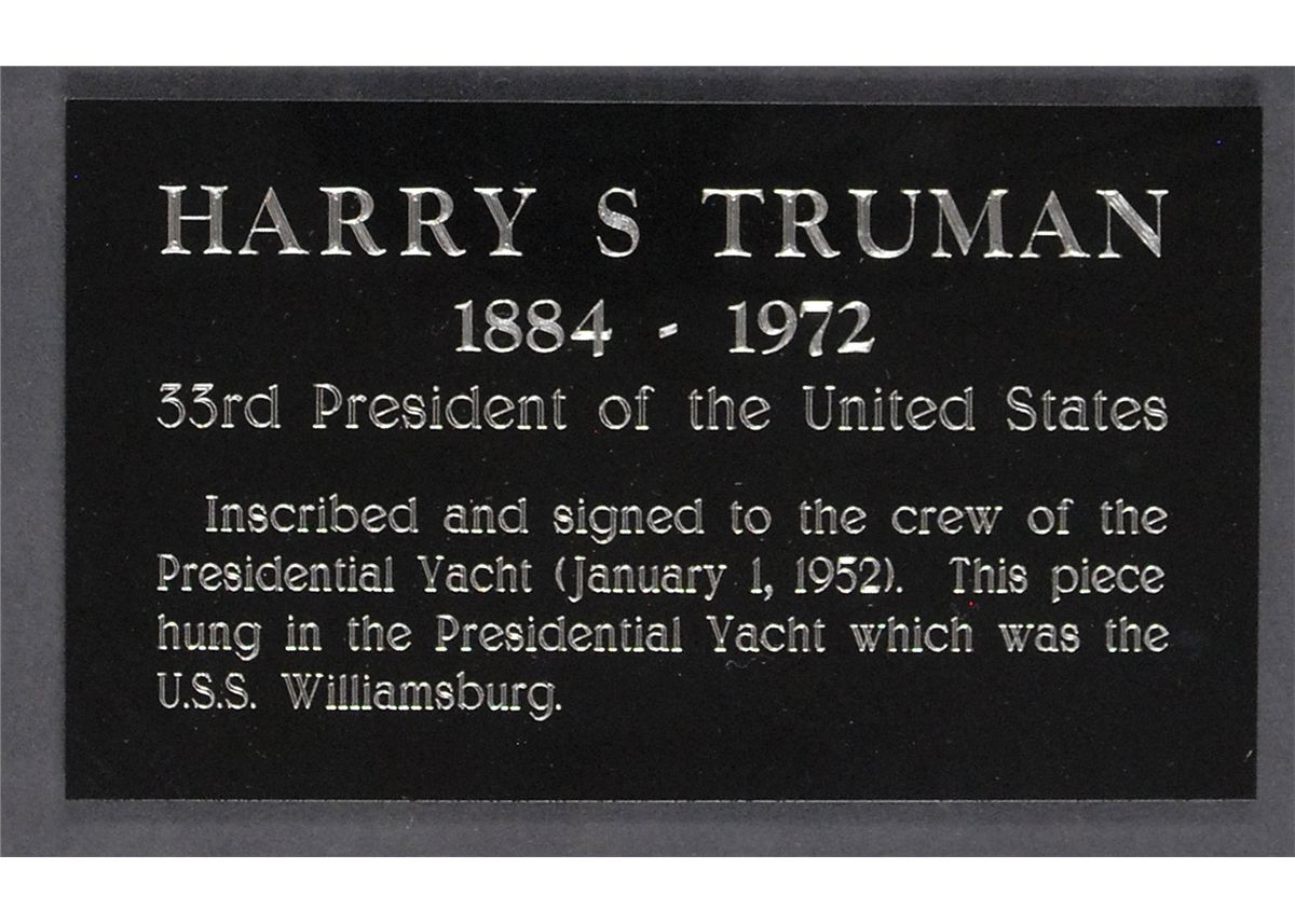 Superb oversized matte-finish 19 x 15 photo, signed, inscribed, and dated in fountain pen to the crew of his presidential yacht (where it was officially displayed), as president, “To The crew of The USS Williamsburg—with kindest regards and appreciation of all the courtesies they have extended to me. Harry S. Truman—White House—New Years Day—1952.” Attractively and archivally double-suede-matted and framed with UV glass and acid-free matting and backing, with a historically descriptive plaque to an overall size of 31.75 x 34. In fine condition. Built in 1915 for wood-pulp magnate Hugh J. Chisholm, the USS Williamsburg was acquired in 1941 by the US Navy and placed into service during World War II. After the war, the Williamsburg relieved the USS Potomac as the presidential yacht, and often carried President Truman to various regions, including Florida, Bermuda, and Cuba. She was decommissioned in 1953 by President Dwight D. Eisenhower, and this portrait, which hung in the USS Williamsburg’s main state dining room, was removed and preserved by Chief Steward Isaac Esperancilla. Along with Arthur Prettyman, Esperancilla had been a valet to Franklin Roosevelt. A remarkable offering deserving of a place in an advanced collection or institution.