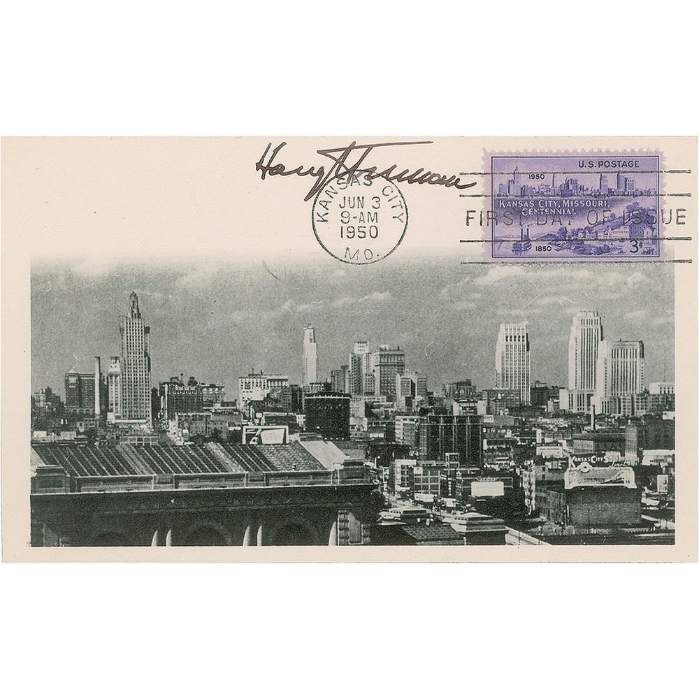 Uncommon vintage matte-finish 6 x 3.5 postcard photo of the Kansas City skyline, bearing a first day cancellation and centennial stamp, postmarked June 3, 1950, signed in fountain pen by Harry S. Truman. Reverse bears a Lionel A. Aucoin collection stamp. In very fine condition.