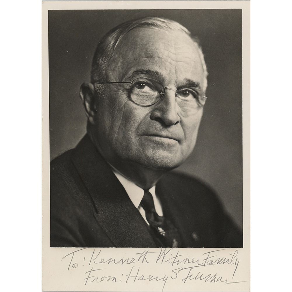 Matte-finish 5 x 7 photo of former American President Harry S. Truman , signed and inscribed in the lower border in ballpoint, "To: Kenneth Witmer Family, From: Harry S. Truman.” In fine condition.