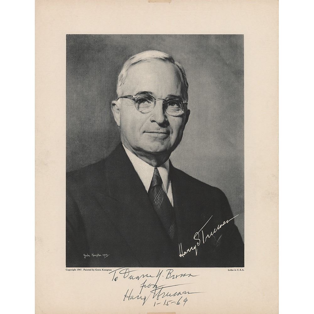 Print of President Truman's 1947 portrait painted by Greta Kempton, 10 x 12.75, signed and inscribed in the lower border in black ballpoint, "To Duane Y. Brown, from, Harry S. Truman, 1-15-69." In fine condition.