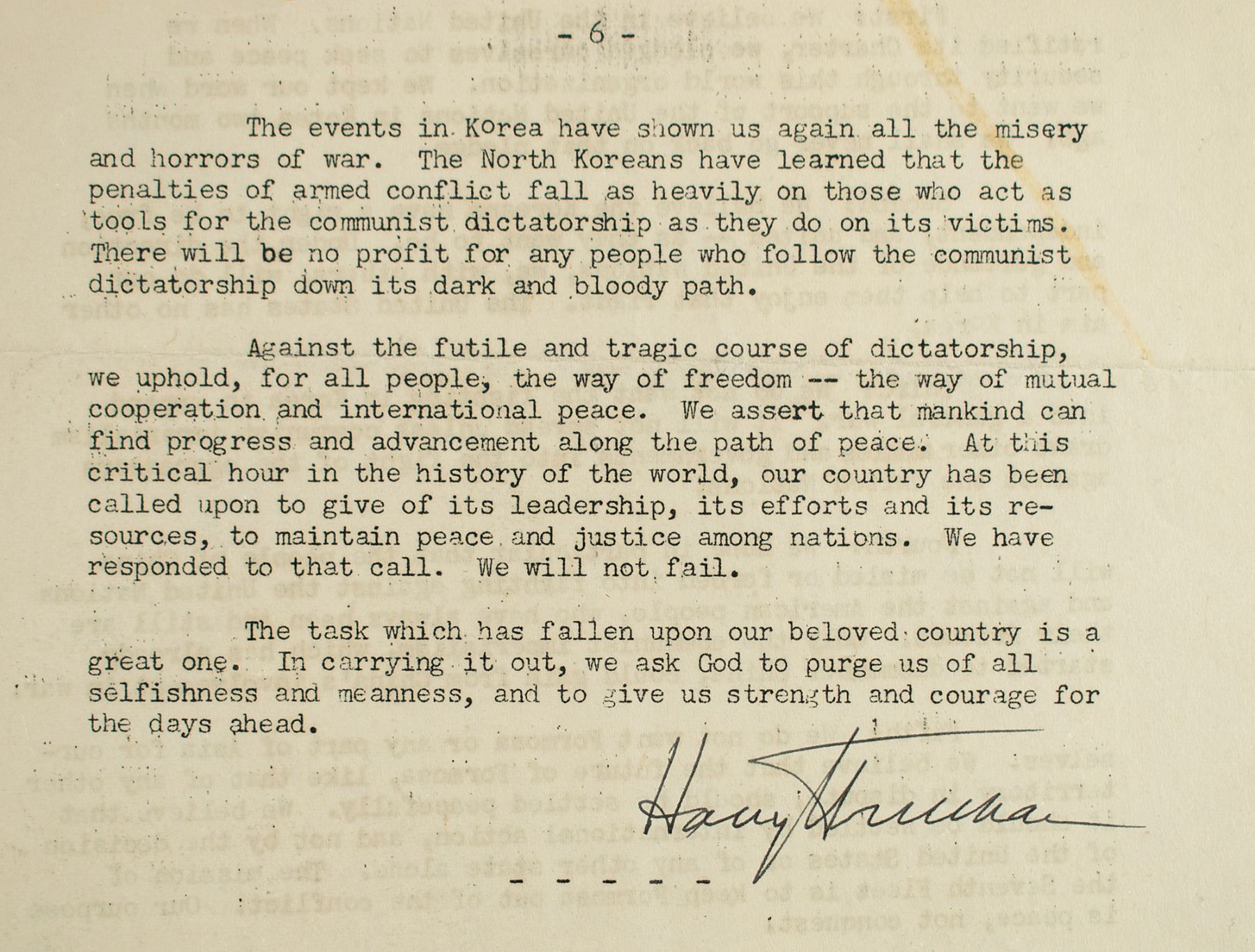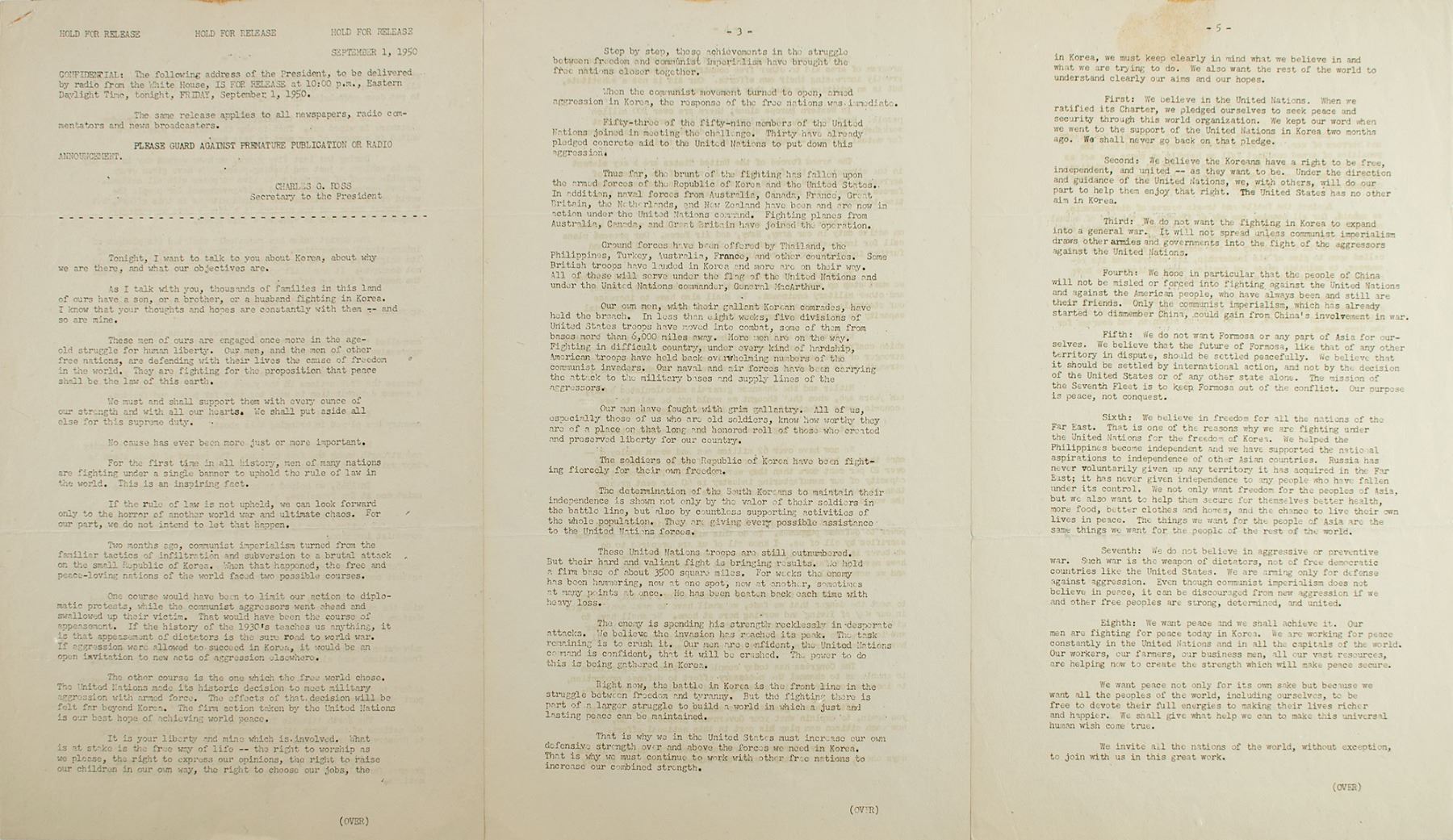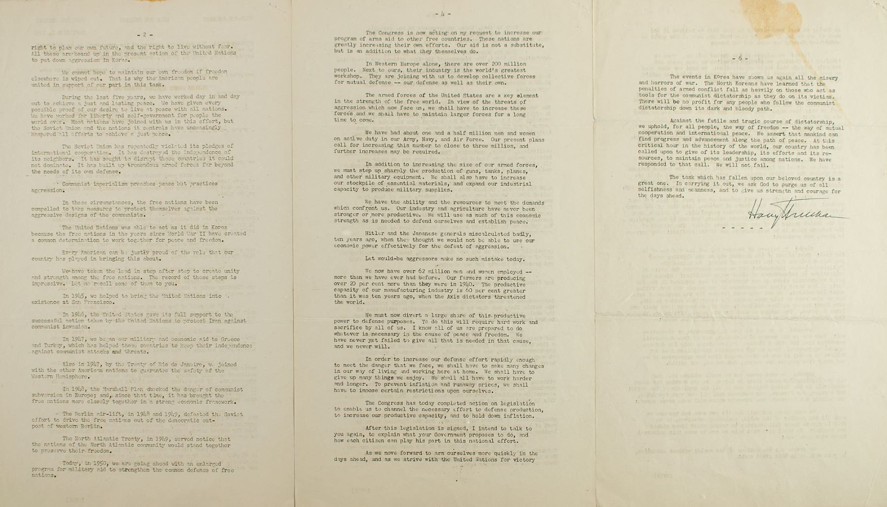 Advance copy of a speech as sent to media outlets, three pages both sides, 8 x 13.75, September 1, 1950, signed at the conclusion in fountain pen, "Harry S. Truman." Speech delivered over the radio about the goals of the United States in Korea. In part: "Tonight, I want to talk to you about Korea, about why we are there, and what our objectives are…These men of ours are engaged once more in the age-old struggle for human liberty. Our men, and the men of other free nations, are defending with their lives the cause of freedom in the world. They are fighting for the proposition that peace shall be the law of this earth…No cause has ever been more just or more important…It is your liberty and mine which is involved. What is at stake is the free way of life—the right to worship as we please, the right to express our opinions, the right to raise our children in our own way, the right to choose our jobs, the right to plan our own future, and the right to live without fear. All these are bound up in the present action of the United Nations to put down aggression in Korea…Right now, the battle in Korea is the front line in the struggle between freedom and tyranny. But the fighting there is part of a larger struggle to build a world in which a just and lasting peace can be maintained…As we move forward to arm ourselves more quickly in the days ahead, and as we strive with the United Nations for victory in Korea, we must keep clearly in mind what we believe in and what we are trying to do. We also want the rest of the world to understand very clearly our aims and our hopes…First: We believe in the United Nations….Second: We believe the Koreans have a right to be free, independent, and united—as they want to be….Third: We do not want the fighting in Korea to expand into a general war…Fourth: We hope in particular that the people of China will not be misled or forced into fighting against the United Nations and against the American people, who have always been and still are their friends…Fifth: We do not want Formosa or any part of Asia for ourselves…Eighth: We want peace and we shall achieve it. Our men are fighting for peace today in Korea…Against the futile and tragic course of dictatorship, we uphold, for all people, the way of freedom—the way of mutual cooperation and international peace. We assert that mankind can find progress and advancement along the path of peace. At this critical hour in the history of the world, our country has been called upon to give of its leadership, its efforts and its resources, to maintain peace and justice among nations. We have responded to that call. We will not fail." In fine condition, with a light stain to the top of the last page.