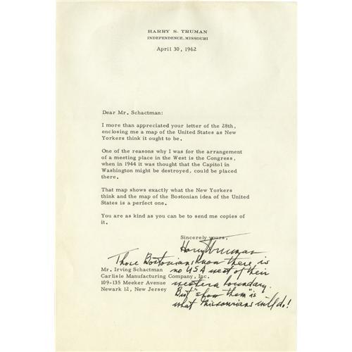 <B>Harry S. Truman Typed Letter With Autograph Note Signed</B></I> "<I>Harry Truman</B></I>". One page, 7.25" x 10.5", on Truman's personal letterhead, Independence, Missouri, April 30, 1962, to Irving Schactman, Newark, New Jersey. The typed letter is a thank you for a novelty map of the United States showing how New Yorkers and Bostonians would redraw the map as they think it ought to be. Truman adds a handwritten note below his closing signature that reads in full: "<I>Those Bostonians know there is no USA west of their western boundary. But 'show them' is what historians will do!</B></I>". The letter displays the usual folds, else fine condition.<BR><BR><b>Shipping:</b> Small Flat (<a target="_blank" href="http://www.heritageauctions.com/common/shipping.php">view shipping information</a>)