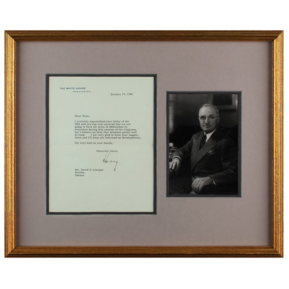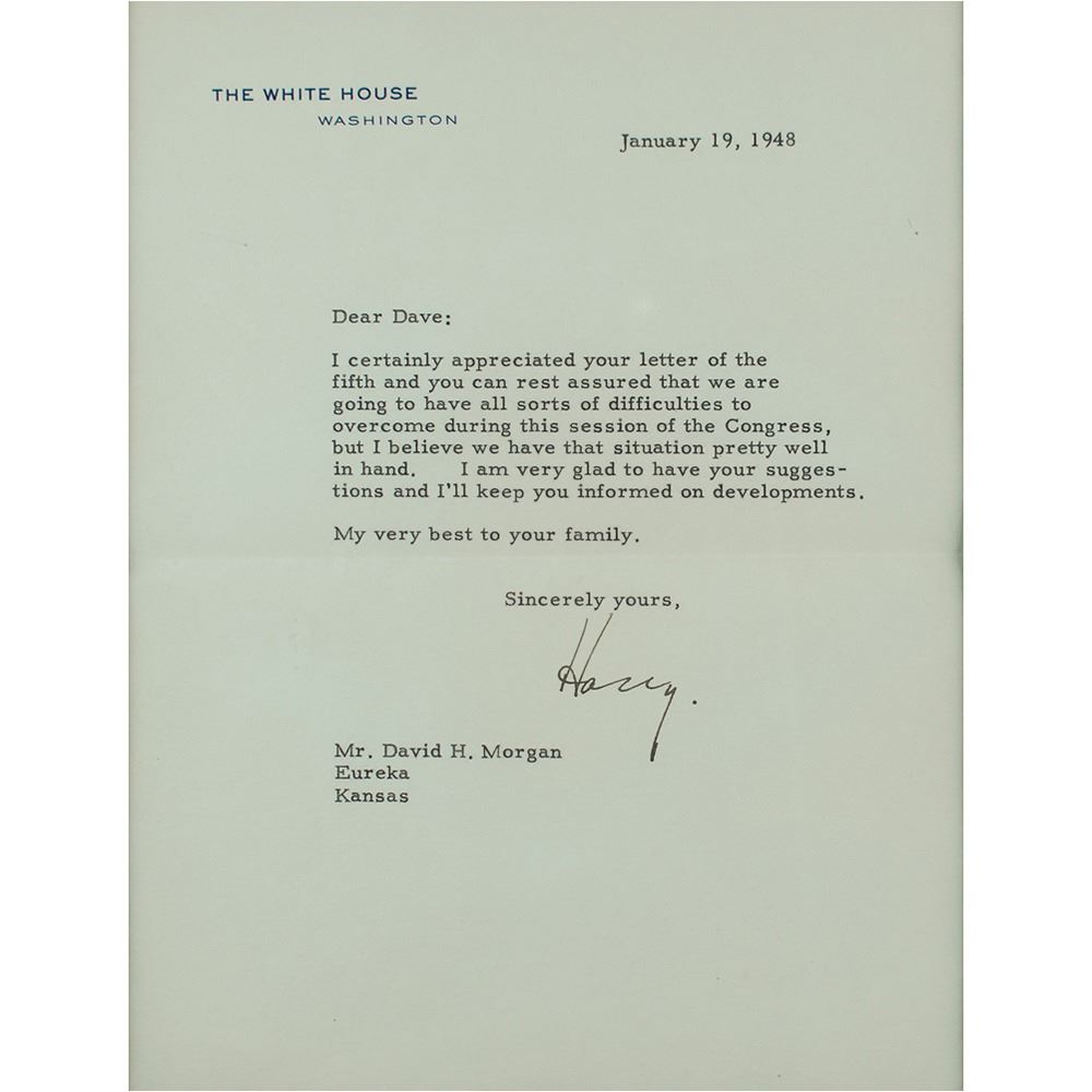 TLS as president signed ‰ÛÏHarry,‰Û one page, 6.5 x 8.5, White House letterhead, January 19, 1948. Letter to David H. Morgan, in part: "I certainly appreciated your letter of the fifth and you can rest assured that we are going to have all sorts of difficulties to overcome during this session of the Congress, but I believe we have that situation pretty well in hand." Nicely double-matted and framed with a portrait to an overall size of 17.5 x 14.25; the original mailing envelope is displayed in a window on the reverse. In fine condition.