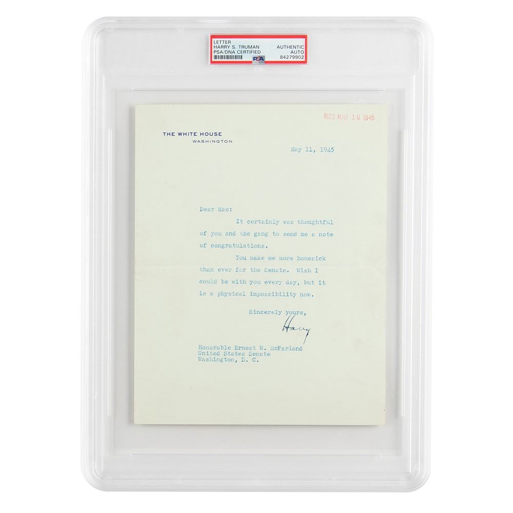 World War II-dated TLS as president signed “Harry,†one page, 7 x 9, White House letterhead, May 11, 1945. Letter to Arizona Senator Ernest McFarland, in full: "It certainly was thoughtful of you and the gang to send me a note of congratulations. You make me more homesick than ever for the Senate. Wish I could be with you every day, but it is a physical impossibility now.†In fine condition. Encapsulated in a PSA/DNA authentication holder.