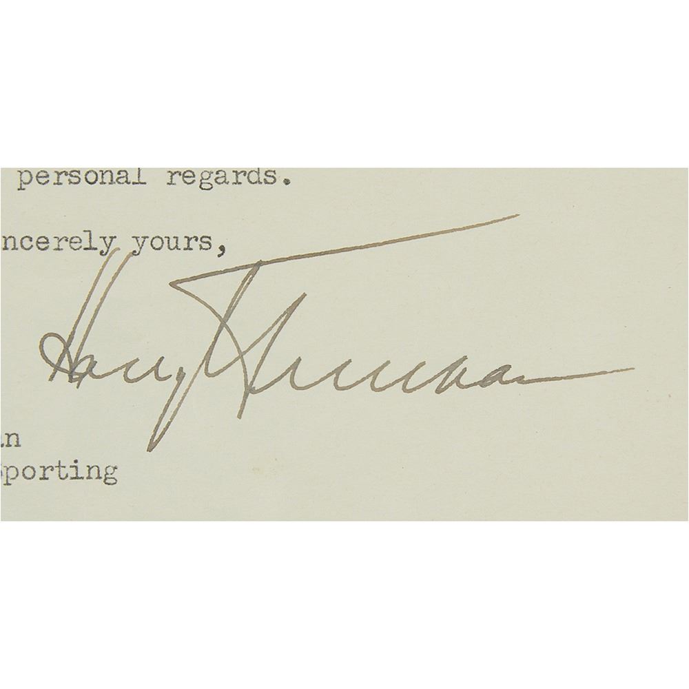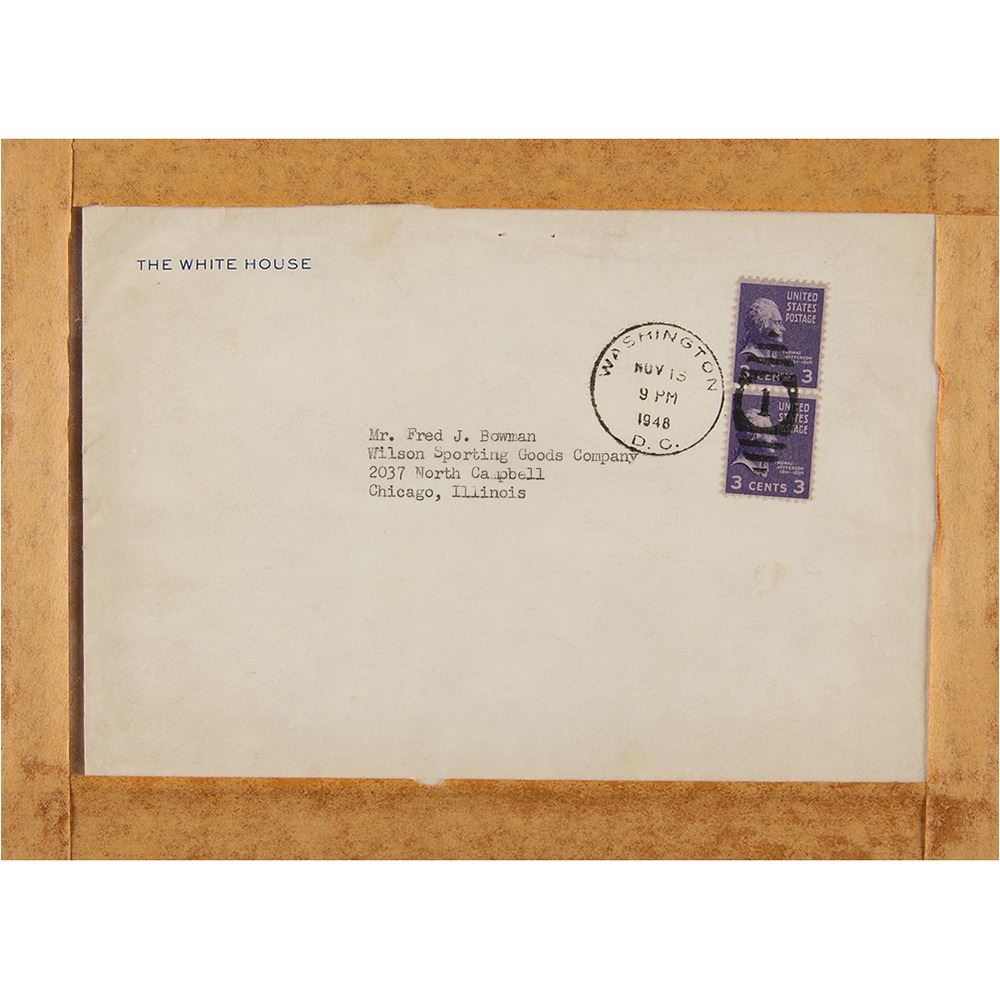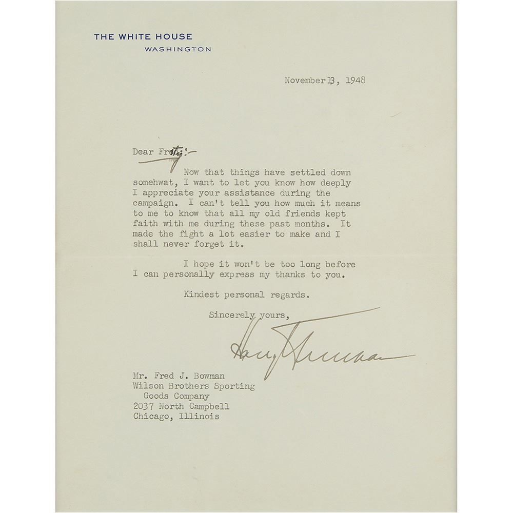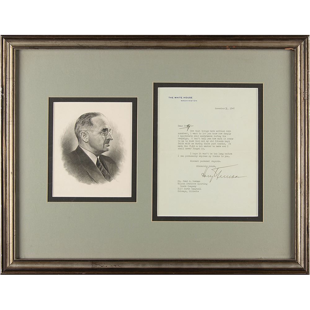 TLS as president, one page, 6.75 x 8.5, White House letterhead, November 13, 1948. Letter to his friend and former comrade Fred J. Bowman, president of the Wilson Brothers Sporting Goods Company, in full: “Now that things have settled down somewhat, I want to let you know how deeply I appreciate your assistance during the campaign. I can’t tell you how much it means to me to know that all my old friends kept faith with me during these past months. It made the fight a lot easier to make and I shall never forget it. I hope it won’t be too long before I can personally express my thanks to you.” Truman strikes through the recipient’s surname in the valediction and writes “Fritz” in his own hand. Handsomely double-matted and framed with an engraved portrait to an overall size of 20.75 x 16.25. In fine condition. Accompanied by the original mailing envelope. Bowman served as a sergeant in Battery D of the 129th Field Artillery Regiment, which was commanded by Captain Harry S. Truman in World War I between 1918-19.