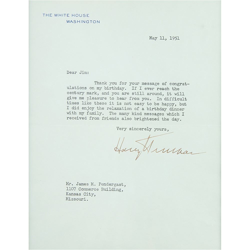 TLS as president, one page, 6.5 x 8.5, White House letterhead, May 11, 1951. Letter to James M. Pendergast, in part: "Thank you for your message of congratulations on my birthday. If I ever reach the century mark, and you are still around, it will give me pleasure to hear from you. In difficult times like these it is not easy to be happy, but I did enjoy the relaxation of a birthday dinner with my family. The many kind messages which I received from friends also brightened my day." Handsomely matted and framed to an overall size of 12.75 x 14.75. In fine condition. Accompanied by the original mailing envelope.