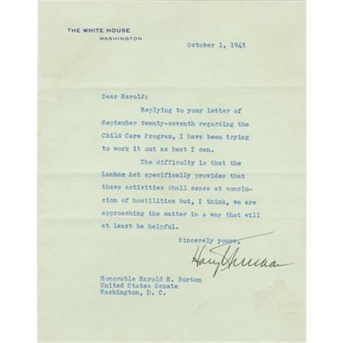Harry S. Truman Typed Letter Signed as President "Harry S. Truman". One page, 7" x 8.75", on White House letterhead, Washington, October 1, 1945, to Senator Harold H. Burton, Washington, D.C. The letter reads in part: "Dear Harold: Replying to your letter of September twenty-seventh regarding the Child Care Program, I have been trying to work it out as best I can. The difficulty is that the Lanham Act specifically provides that these activities shall cease at conclusion of hostilities but, I think, we are approaching the matter in a way that will at least be helpful." <BR>During WW II, millions of women entered the workforce in war production areas. The need for an organized childcare program became apparent. Congress responded by including provisions in the Community Facilities Act of 1941, (commonly known as the Lanham Act), which created Lanham Act centers for child care. The establishment of the Lanham Act centers marked the first time the federal government became directly involved in providing childcare services to children who were not poor. The centers were open to all children whose parents worked in war production areas. The federally sponsored Lanham Act centers closed in 1946.<BR>The letter has the usual fold but is otherwise beautiful, bright and in fine condition. Comes laid-in a custom paper folder specifically designed for collection of R. O. McNiel.<BR><BR><BR><b>Shipping:</b> Flat Material, Small (<a target="_blank" href="http://www.heritageauctions.com/common/shipping.php">view shipping information</a>)