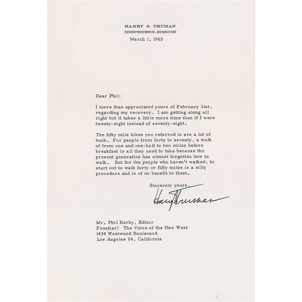TLS, one page, 7.25 x 10.5, personal letterhead, March 1, 1963. Letter to Phil Kerby, editor of Frontier! The Voice of the New West. In part: "The fifty mile hikes you referred to are a lot of bunk. For people from forty to seventy, a walk of from one and one-half to two miles before breakfast is all they need to take because the present generation has almost forgotten how to walk. But for the people who haven't walked, to start out to walk forty or fifty miles is a silly procedure and is of no benefit to them." In fine condition.