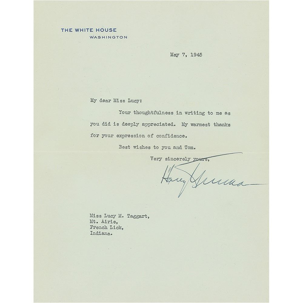 World War II-dated TLS as president, one page, 7 x 8.75, White House letterhead, May 7, 1945. Letter to Lucy M. Taggart, in full: "Your thoughtfulness in writing to me as you did is deeply appreciated. My warmest thanks for your expression of confidence. Best wishes to you and Tom." In fine condition. Accompanied by the original White House mailing envelope. A decidedly early letter from President Truman, who was sworn into office just 25 days earlier.