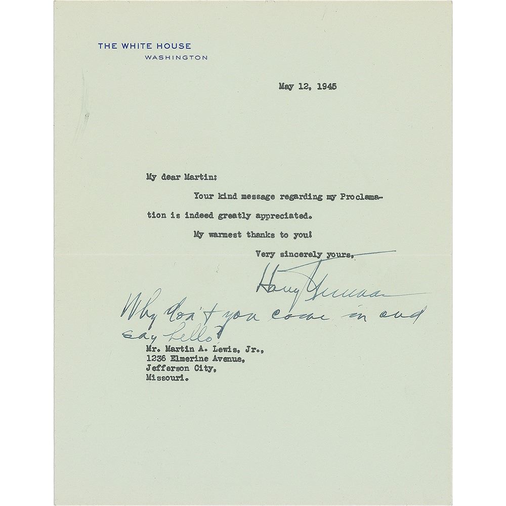 TLS, one page, 7 x 8.75, White House letterhead, May 12, 1945. Letter to Martin A. Lewis, in full, “Your kind message regarding my Proclamation is indeed greatly appreciated. My warmest thanks to you!†Truman adds a handwritten postscript: “Why don’t you come in and say hello?†In fine condition. Accompanied by the original White House mailing envelope. Truman’s friend, Martin A. Lewis, Jr., had served as Chief of Missouri Parks and Refuges from 1929-1932. Just four days earlier, President Truman officially announced the surrender of Germany from the White House Radio Room on May 8, 1945, signaling the end of World War II.