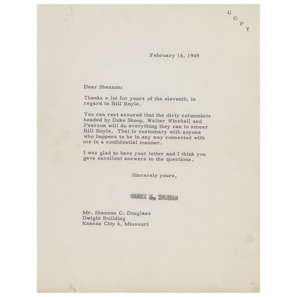 TLS as president signed “H.S.T.,†one page, 7 x 8.75, White House letterhead, February 16, 1949. Letter to the Hon. William M. Boyle, Jr., vice-chairman of the Democratic National Committee. In full: "I am enclosing you copy of a letter which I have just received from Shannon Douglass together with copy of my reply." In fine condition, with a rusty paperclip impression to the top edge. Accompanied by the original mailing envelope and one of the enclosures referenced, a copy of Truman's letter to Douglass, in part: "You can rest assured that the dirty columnists headed by Duke Shoop, Walter Winchell and Pearson will do everything they can to smear Bill Boyle. That is customary with anyone who happens to be in any way connected with me in a confidential manner."