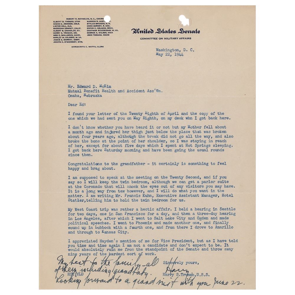 World War II-dated TLS signed “Harry,†one page, 8 x 10.5, United States Senate, Committee on Military Affairs letterhead, May 22, 1944. Letter to longtime friend Edward McKim, in full: "I found your letter of the Twenty Eighth of April and the copy of the one which we had sent you on May Eighth, on my desk when I got back here. I don't know whether you have heard it or not but my Mother fell about a month ago and injured her thigh just below the place that was broken about four years ago, although the break did not go all the way, and also broke the bone at the point of her shoulder, so I was staying in reach of her, except for about five days which I spent at Hot Springs sleeping. I got back here Saturday morning and have been going the usual rounds since then. Congratulations to the grandfather—it certainly is something to feel happy and brag about. I am supposed to speak at the meeting on the Twenty Second, and if you say so I will keep the twin bedroom, although we can get a parlor suite at the Coronado that will knock the eyes out of any visitors you may have. It is a long way from taw however, and I will do what you want in the matter. I am writing Mr. Francis Kuhn, Executive Assistant Manager, Hotel Statler, telling him to hold the twin bedroom for us. My Key West trip was rather a hectic affair. I held a hearing in Seattle for two days, one in San Francisco for a day, and then a three-day hearing in Los Angeles, after which I went to Salt Lake City and Ogden and made political speeches. I went to Phoenix and made another one, and finally wound up in Lubbock with a fourth one, and from there I drove to Amarillo and through to Kansas City. I appreciated Hayden's mention of me for Vice President, but as I have told you time and time again I am not a candidate and don't expect to be. It would absolutely ruin me from the standpoint of the Senate and throw away nine years of the hardest sort of work." Truman adds a handwritten postscript: "My best to the family—all of them including grandbaby. Looking forward to a grand visit with you June 22." In fine condition, with two file holes to the top edge.