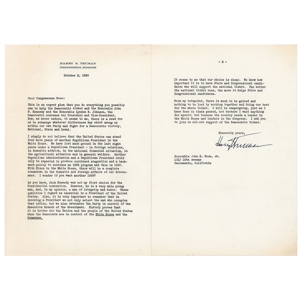 Desirable TLS, two pages, 7.25 x 10.5, personal letterhead, October 5, 1960. Letter to California Congressman John E. Moss, in full: "This is an urgent plea that you do everything you possibly can to help the Democratic ticket and the Honorable John F. Kennedy and the Honorable Lyndon B. Johnson, the Democratic nominees for President and Vice-President. Now, as never before, it seems to me, there is a need for us to submerge whatever differences may exist among us within our own Party and fight for a Democratic victory, National, State and Local. I simply do not believe that the United States can stand four more years of another Republican President in the White House. We have lost much ground in the White House. We have lost much ground in the last eight years under a Republican president—in foreign relations, in domestic affairs, in the national financial situation, in the agricultural situation and in general welfare. Another Republican Administration and a Republican President could only be expected to produce continued stagnation and a backward policy to continue an 1896 program and this is 1960. With Nixon in the White House, there will be a complete breakdown in the domestic and foreign affairs of our Government. I wonder if you want another 1929? As you know, Jack Kennedy was not my first choice for the Presidential nomination. However, he is a very able young man, and, in my opinion, a man of integrity and honor. These qualities I regard as essential in a President of the United States. Also, it is very important to remember that in choosing a President we not only select the man who occupies that office, but we also determine the Party in control of the Executive Branch of the Government. History proves that it is better for the nation and the people of the United States when the Democrats are in control of the White House and the Congress. It seems to me that our choice is clear. We know how important it is to have State and Congressional candidates who will support the national ticket. The better the national ticket runs, the more it helps State and Congressional candidate. From my viewpoint, there is much to be gained and nothing to be lost by working together and doing our best for the whole ticket. I will be campaigning, just as I have done in times passed, not because I want anything for myself, but because the country needs a leader in the White House and leaders in the Congress. I ask you to join in all-out support of the Democratic ticket.†In fine condition.