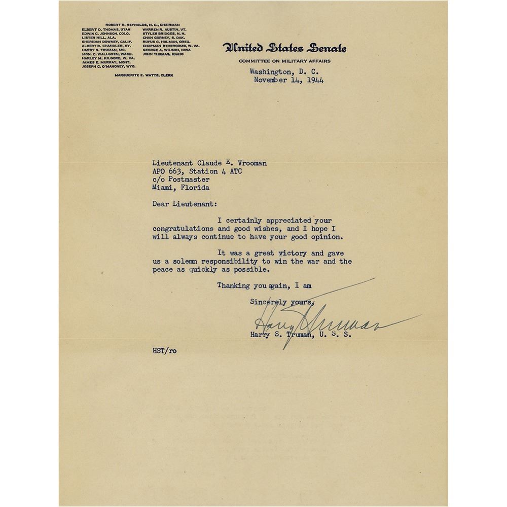 World War II–dated TLS, one page, 8 x 10.25, United States Senate letterhead, November 14, 1944. Letter to Lt. Claude E. Vrooman, in part: "I certainly appreciated your congratulations and good wishes, and I hope I will always continue to have your good opinion. It was a great victory and gave us a solemn responsibility to win the war and the peace as quickly as possible." In fine condition. Accompanied by the original mailing envelope, bearing a pre-printed free frank. Superior content from Truman, who, thrust into the presidency some four months later, would indeed deliver a quick victory in World War II.