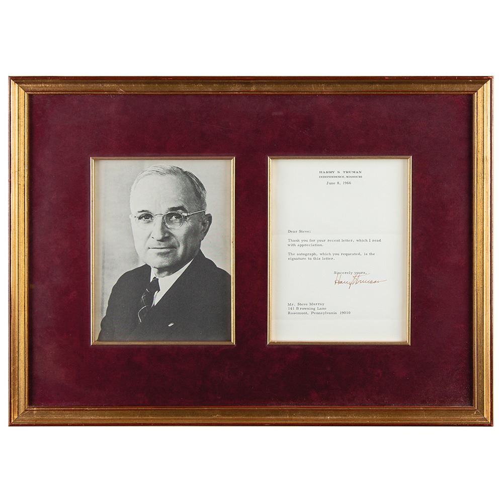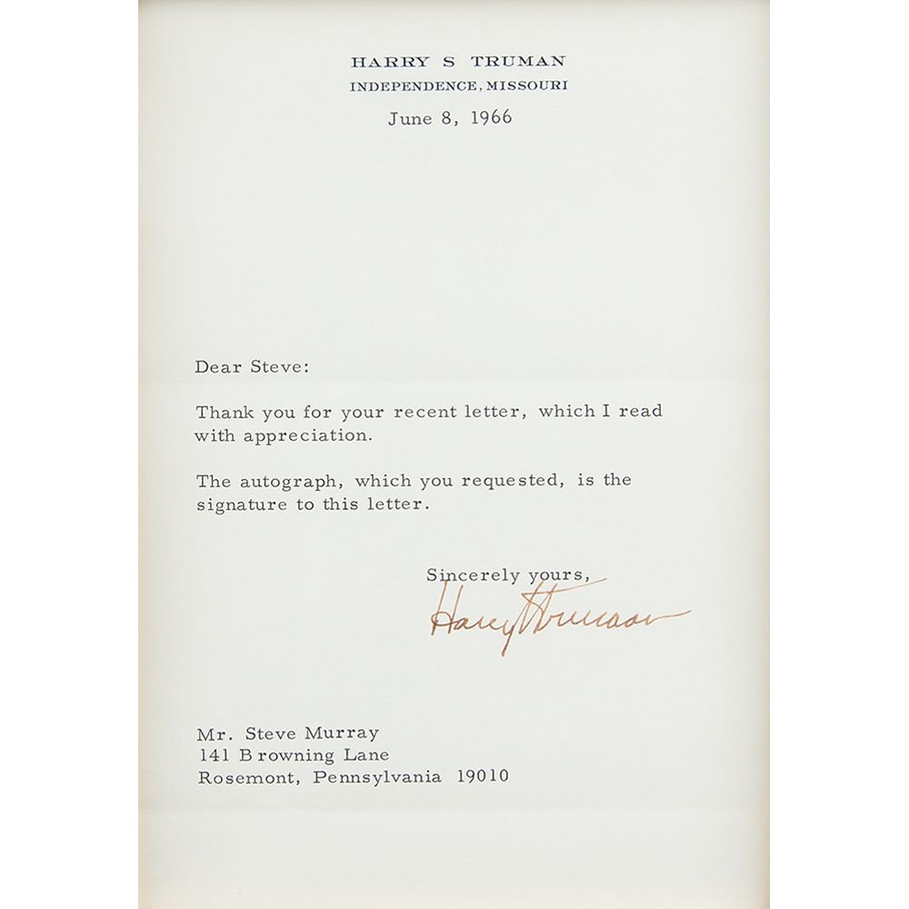 TLS, one page, 5.5 x 7.75, personal letterhead, June 8, 1966. Letter to Steve Murray, in full: "Thank you for your recent letter, which I read with appreciation. The autograph, which you requested, is the signature to this letter." Nicely suede-matted and framed with a portrait to an overall size of 20 x 14.5. In fine condition.