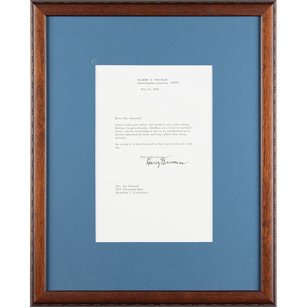 TLS, one page, 6.75 x 10.25, personal letterhead, May 13, 1966. Letter to Joe Garrett, in full: "I have read your letter and found it very interesting. Service in government, whether on a local or national level, can be rewarding if one is so constituted as to derive satisfaction from serving than being served. As a rule it is best to start at the local level and work up." Attractively matted and framed to an overall size of 14.5 x 18. In fine condition.