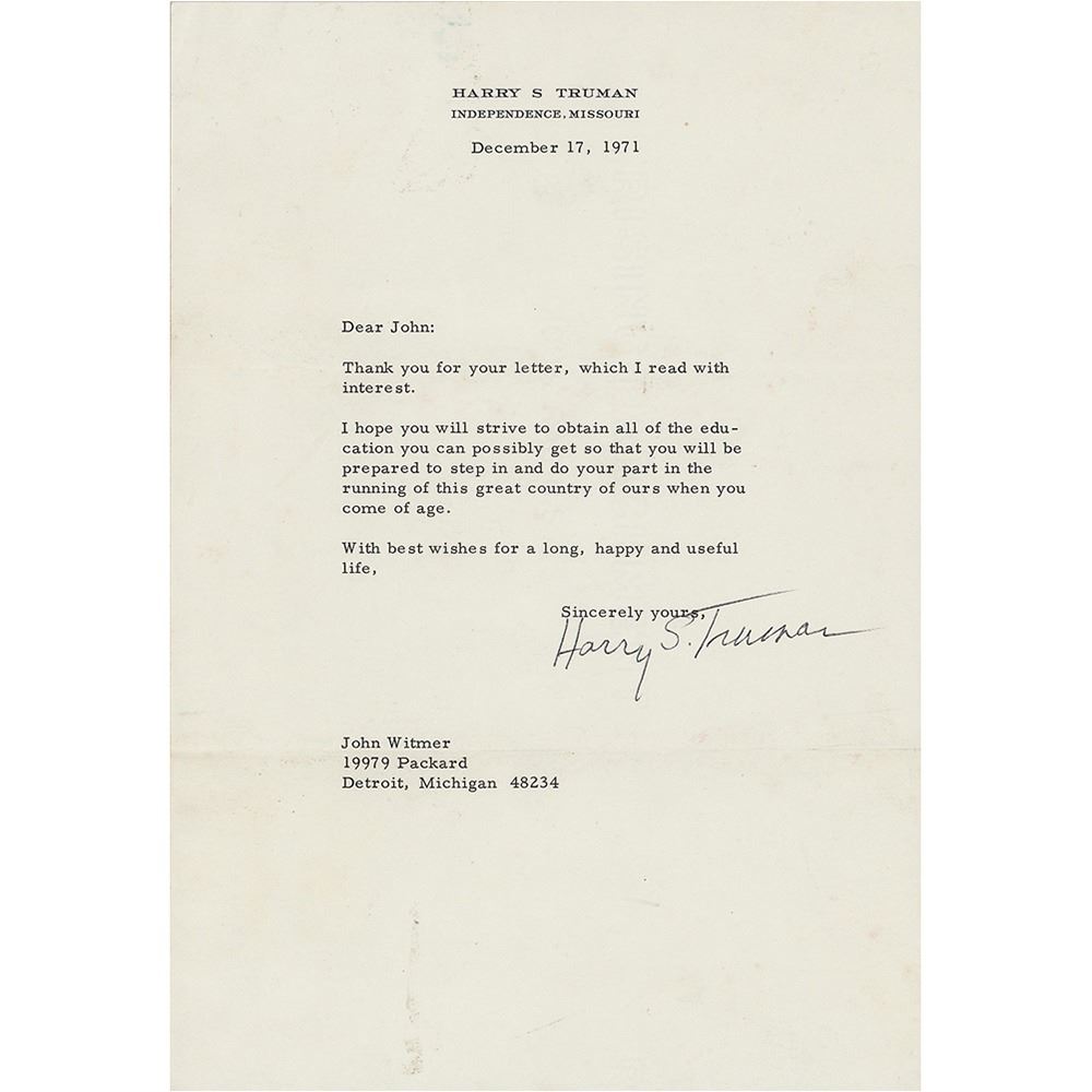 TLS, one page, 7.25 x 10.5, personal letterhead, December 17, 1971. Letter to John Witmer, in part: “Thank you for your letter, which I read with interest. I hope you will strive to obtain all of the education you can possibly get so that you will be prepared to step in and do your part in the running of this country of ours when you come of age.” In fine condition.