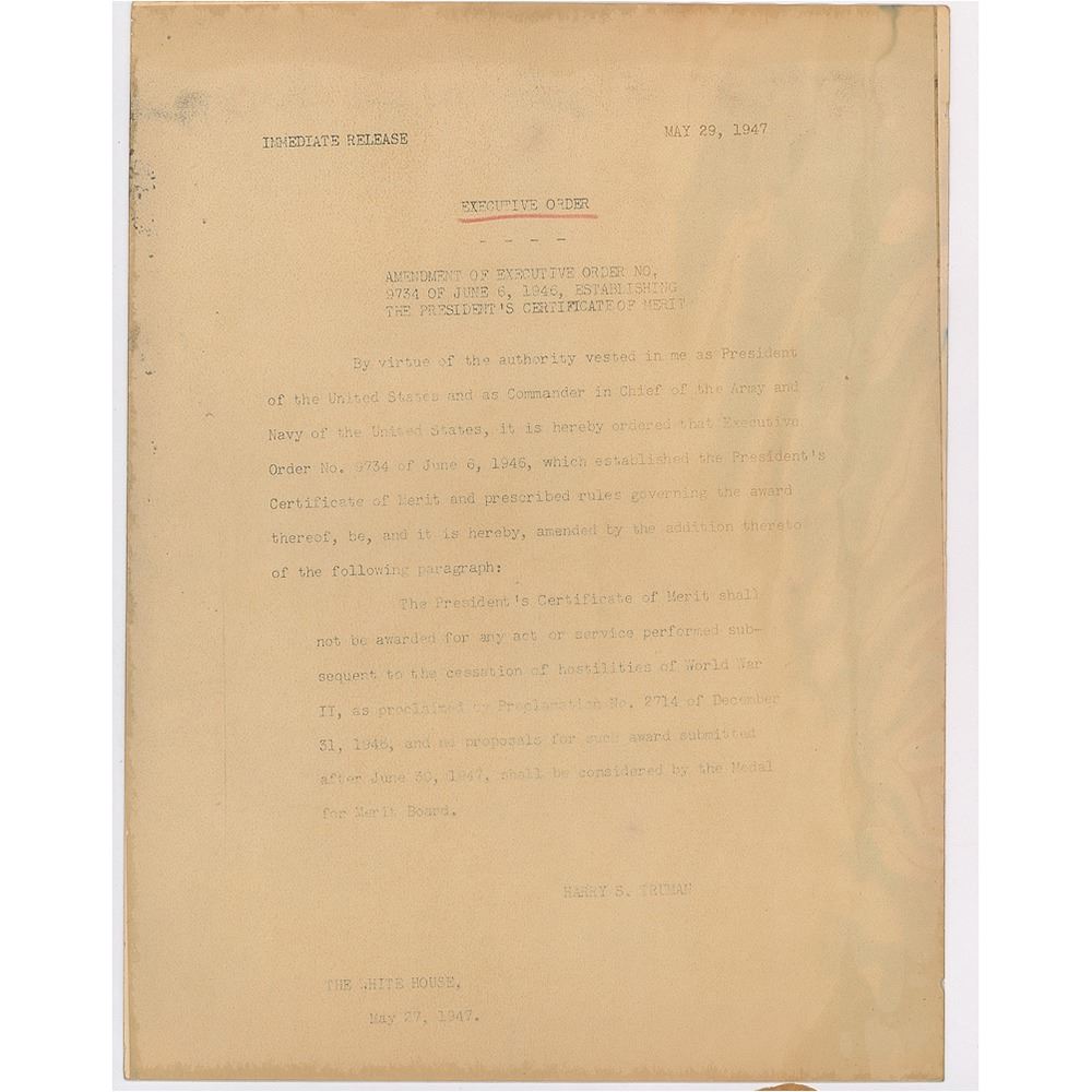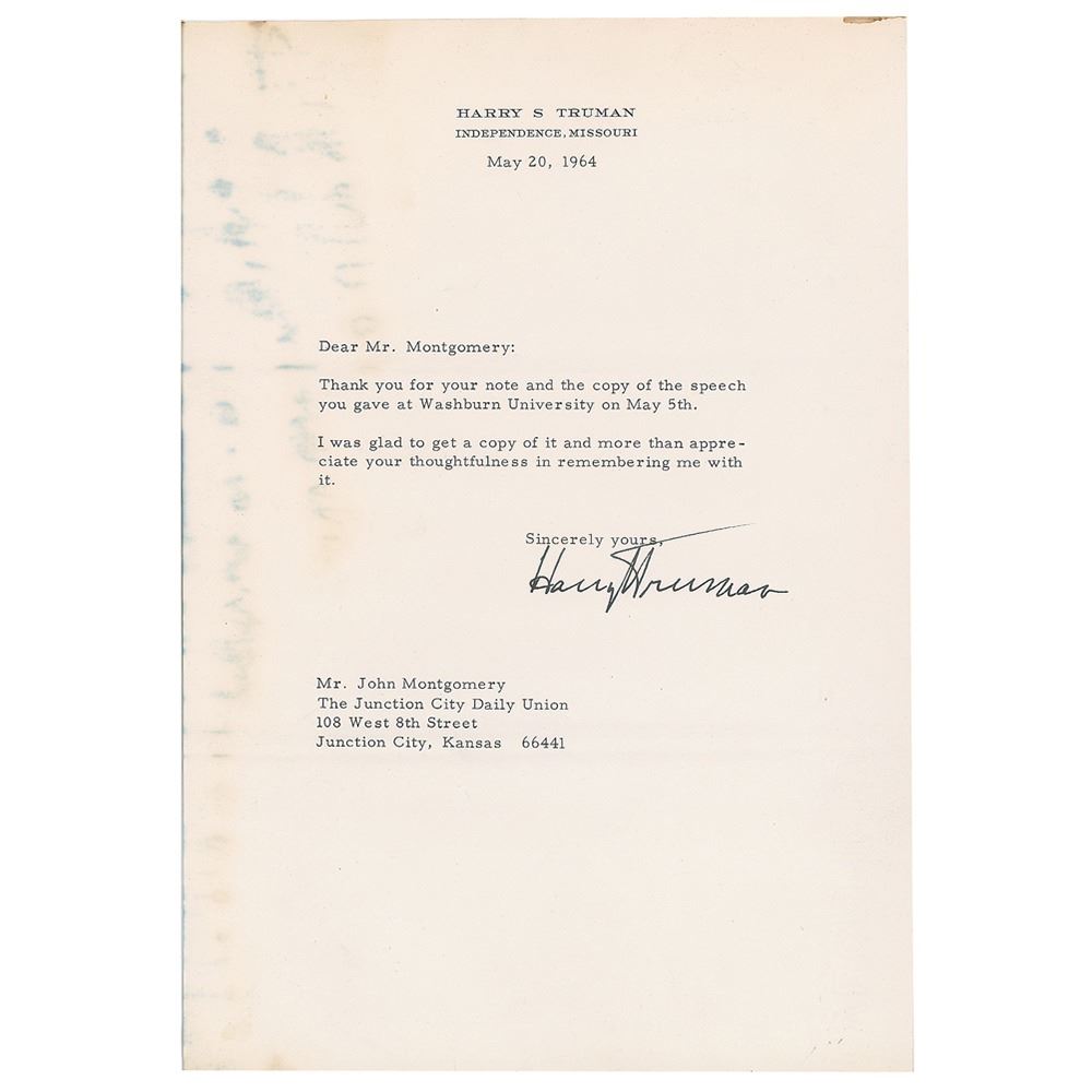 TLS, one page, 7.25 x 10.5, personal letterhead, May 20, 1964. Letter to John Montgomery of the Junction City Daily Union, in full: "Thank you for your note and the copy of the speech you gave at Washburn University on May 5th. I was glad to get a copy of it and more than appreciate your thoughtfulness in remembering me with it." In very good to fine condition, with dampstaining, and associated rippling, to the left side; the signature is clean and unaffected. Accompanied by a press release copy of Truman's executive order to amend the order establishing the "President's Certificate of Merit."