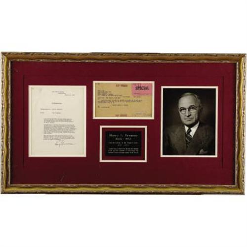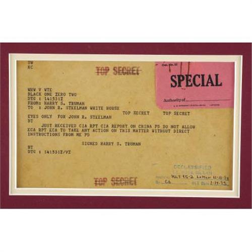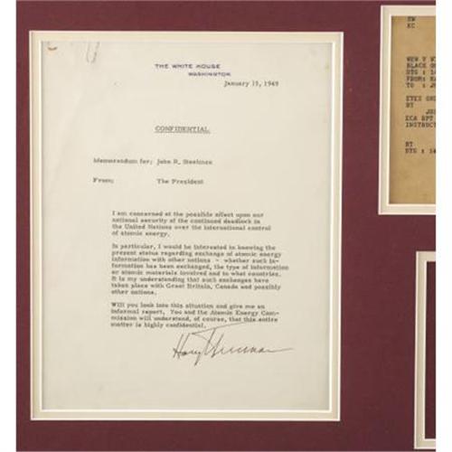 <B>Harry S. Truman Typed Letter</B></I> <B>Signed and Original Top Secret Telegram</B></I>. Two items created by 33rd President Harry S. Truman (1884-1972), both with excellent content. TLS: one page, 7.5” x 10”, White House letterhead, January 15, 1949, to Assistant to the President (now called Chief of Staff) John R. Steelman (1900-1999) involving atomic energy. Truman writes in full:<I> “I am concerned at the possible effect upon our national security of the continued deadlock in the United Nations over the international control of atomic energy. In particular, I would be interested in knowing the present status regarding exchange of atomic energy information with other nations-whether such information has been exchanged, the type of information or atomic materials involved and to what countries. It is my understanding that such exchanges have taken place with Great Britain, Canada and possibly other nations. Will you look into this situation and give me an informal report. You and the Atomic Energy Commission will understand, of course, that this entire matter is highly confidential. signed Harry Truman” </B></I>Telegram: 5” x 8”, includes “Special” sticker attached to top right corner, also to John R. Steelman, marked “Top Secret” in four places, reading in full: <I>“EYES ONLY FOR JOHN R. STEELMAN / JUST RECEIVED CIA RPT CIA REPORT ON CHINA PD DO NOT ALLOW ECA RPT ECA TO TAKE ANY ACTION ON THIS MATTER WITHOUT DIRECT INSTRUCTIONS FROM ME PD / SIGNED HARRY S. TRUMAN” </B></I>The bottom right corner includes information on the declassification of the item in 1995. The letter is in fine condition, with a paper clip mark in the top left corner; the telegram is in fine condition. Both are beautifully double matted with a fine 8” x 10” portrait of Truman as President and a 3.5” x 5” plaque engraved with information about his terms as Senator from Missouri (1935-1945) and President (1945-1953). The overall size as framed is 34” x 19.5” (the plexiglass includes two small scratches).<BR><BR><b>Shipping:</b> Books & Catalogs (<a target="_blank" href="http://www.heritageauctions.com/common/shipping.php">view shipping information</a>)
