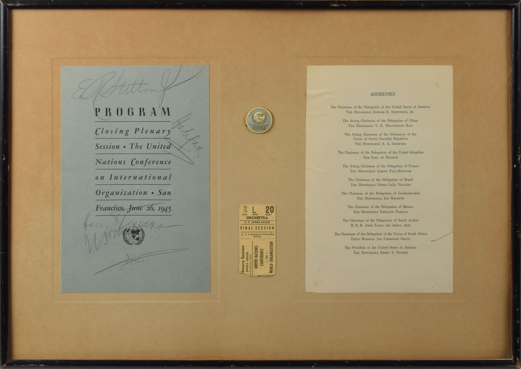 Program cover from the "Closing Plenary Session, The United Nations Conference on International Organization, San Francisco, June 26, 1945," 5.75 x 9, signed in pencil by Truman as president as well as the following leaders: US Secretary of State Edward Reilly Stettinius, Jr., "E. R. Stettinius, Jr."; Prime Minister of South Africa Jan Christiaan Smuts, "J. C. Smuts"; British Ambassador to the United States Edward Wood, 1st Earl of Halifax, "Halifax"; and Foreign Minister Faisal of Saudi Arabia, who later served as king. Mounted to a 20 x 14.5 board along with a program sheet listing the conference's speakers, a ticket stub for the conference, and a rare original conference lapel pin. Framed and in fine condition, with the frame somewhat loose.