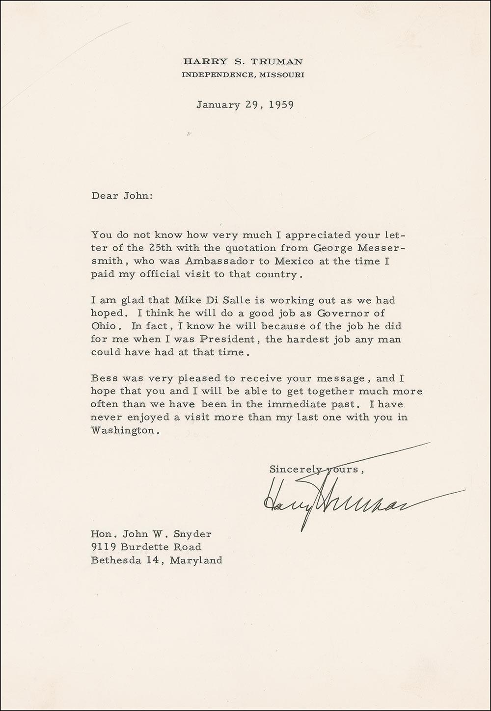 TLS, one page, 7.25 x 10.5, personal letterhead, January 29, 1959. Truman writes John W. Snyder, his former treasury secretary. In full: “You do not know how very much I appreciated your letter of the 25th with the quotation from George Messersmith, who was Ambassador to Mexico at the time I paid my official visit to that country. I am glad that Mike Di Salle is working out as we had hoped. I think he will do a good job as Governor of Ohio. In fact, I know he will because of the job he did for me when I was President, the hardest job any man could have had at the time. Bess was very pleased to receive your message, and I hope that you and I will be able to get together much more often than we have been in the immediate past. I have never enjoyed a visit more than my last one with you in Washington.” Truman’s memory failed him a bit in this letter, as he had transferred his ambassador to Mexico to Argentina almost 10 months before his visit. In fine condition, with lower left corner crease and a few wrinkles.