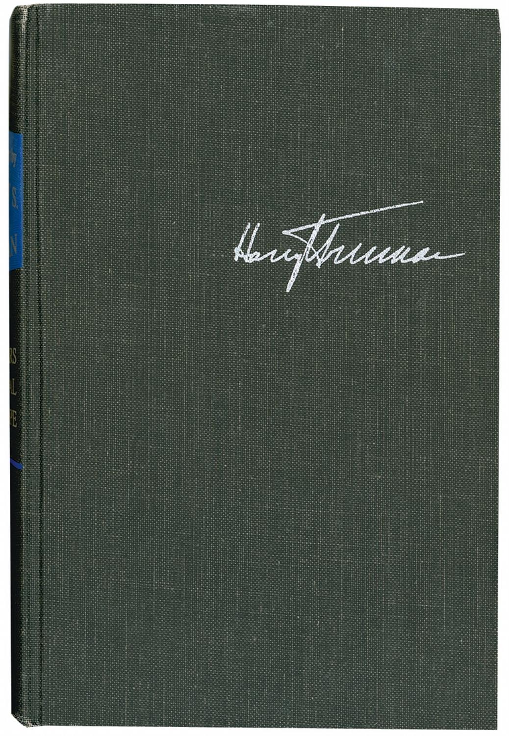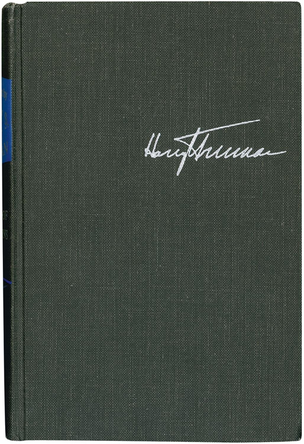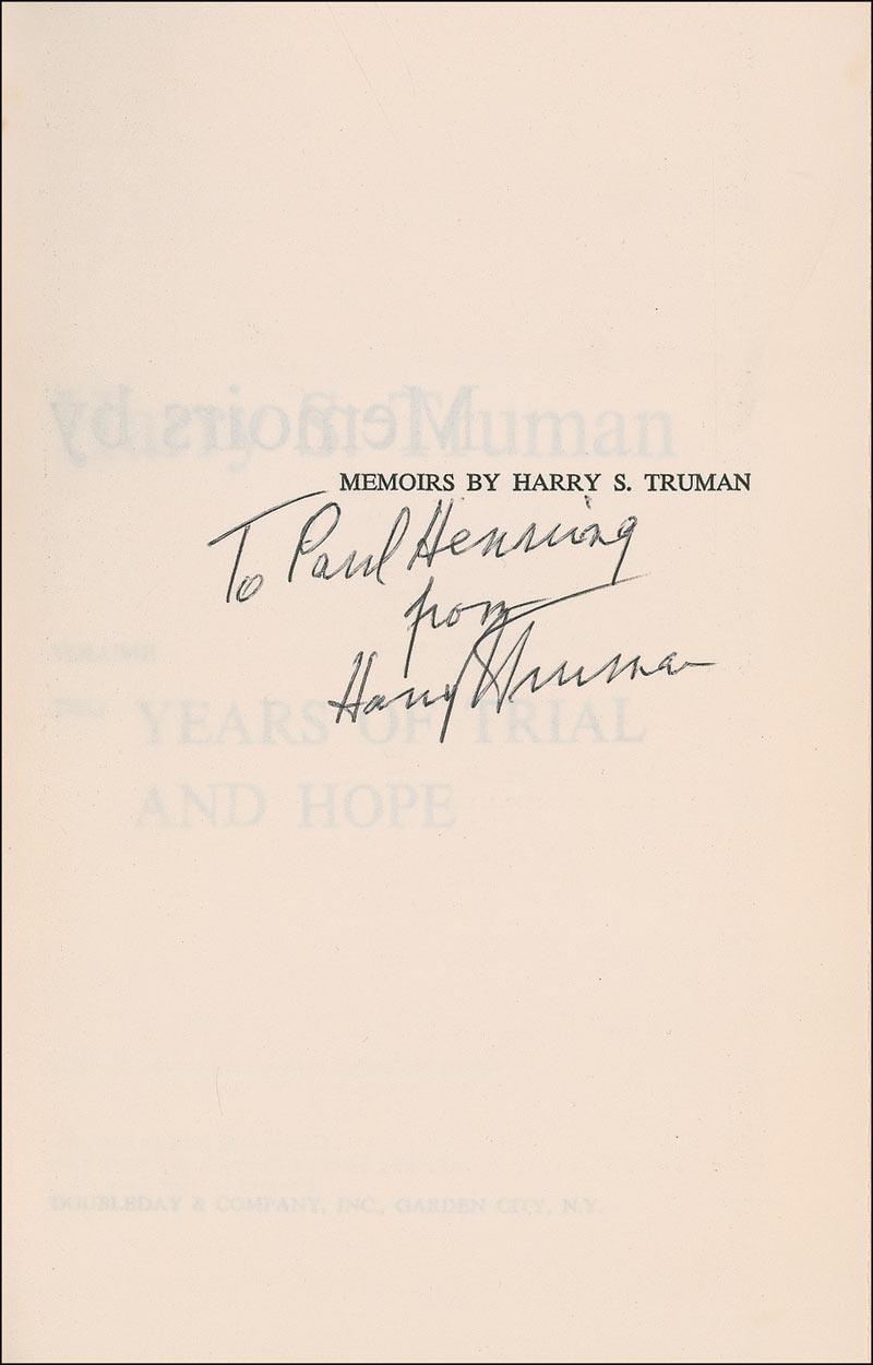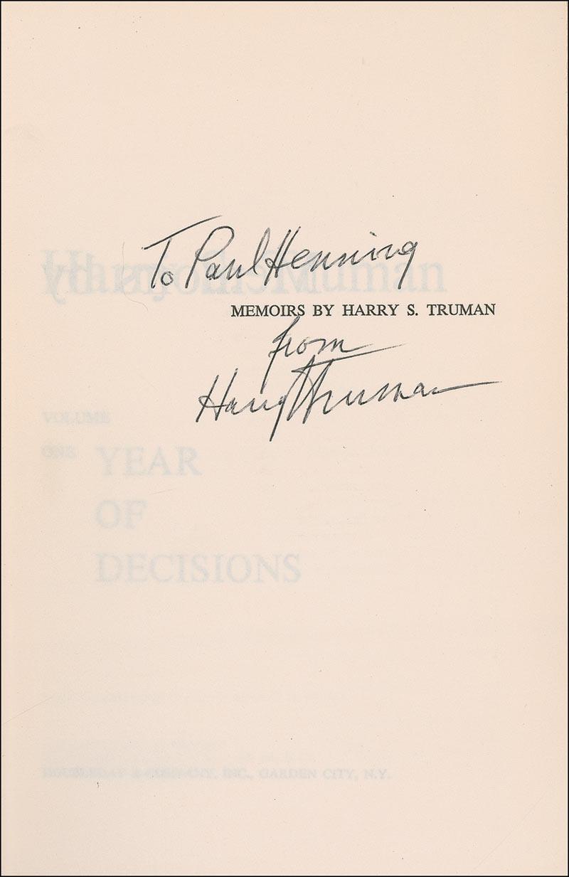 Signed book: Memoirs (Year of Decisions and Years of Trial and Hope) in two volumes. First edition. Garden City: Doubleday & Company, 1956. Hardcover with dustjacket, 6 x 8.5, 594 plus 596 pages. Signed and inscribed in black ballpoint on both half-title pages, “To Paul Henning from Harry S. Truman.” Paul Henning (1911-2005) was a producer and writer, most famous for the successful sitcom The Beverly Hillbillies, he was crucial in the development of several "rural" comedies for CBS. Henning was born on a farm and grew up in Independence, Missouri. While working in a drugstore as a teenager, he met future President Harry S. Truman, who advised him to become a lawyer. In fine condition, with Henning’s personal bookplates affixed to inside front covers of both volumes and a bit of trivial wear to covers.