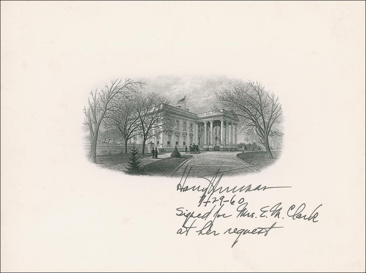 Engraved portrait of the White House, 8 x 6, signed and inscribed in black ink, “Harry S. Truman 7-29-60, Signed for Mrs. E. M. Clark at her request.” In fine condition, with some mild edge toning, and mounting remnant along top edge of reverse.