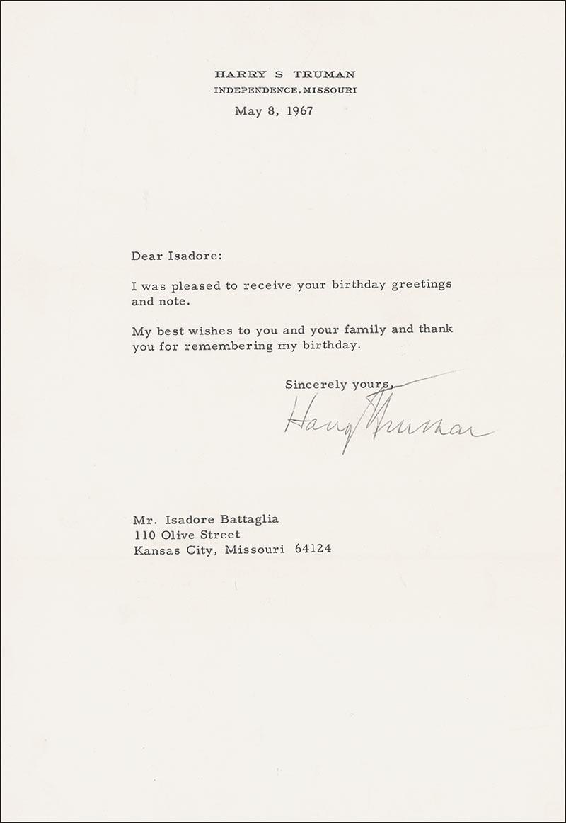 TLS, one page, 7.25 x 10.5, personal letterhead, May 8, 1967. Letter of thanks for birthday wishes. In full: “I was pleased to receive your birthday greetings and note. My best wishes to you and your family and thank you for remembering my birthday.” In fine condition. Accompanied by the original mailing envelope.
