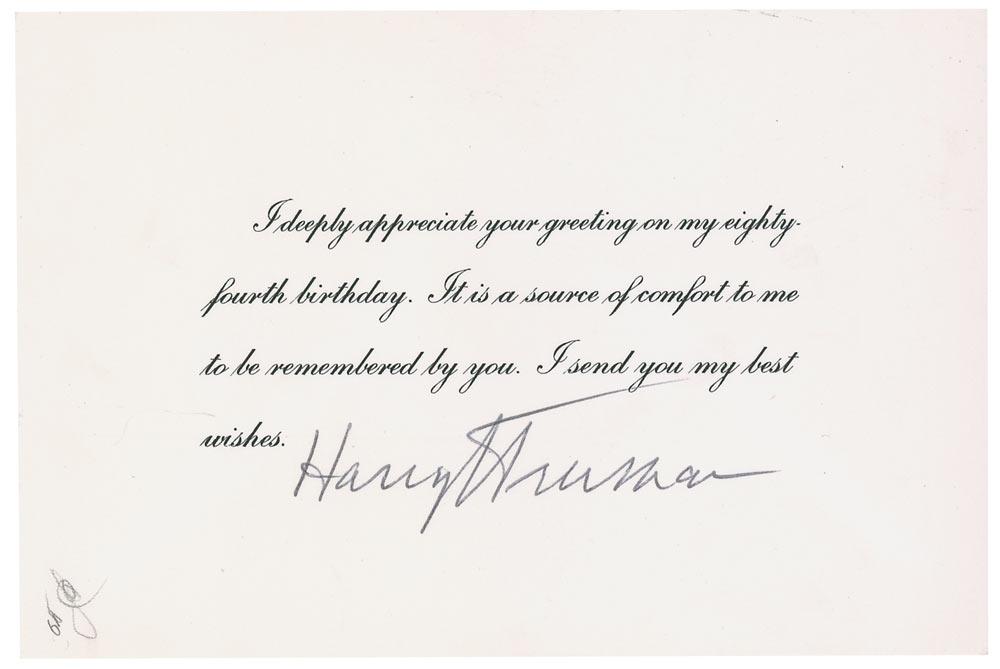 Black ballpoint signature, “Harry S. Truman,” on a 6 x 4 white card with an imprinted thank you message for an 84th birthday acknowledgment. In fine condition with a small pencil notation. Accompanied by original mailing envelope.