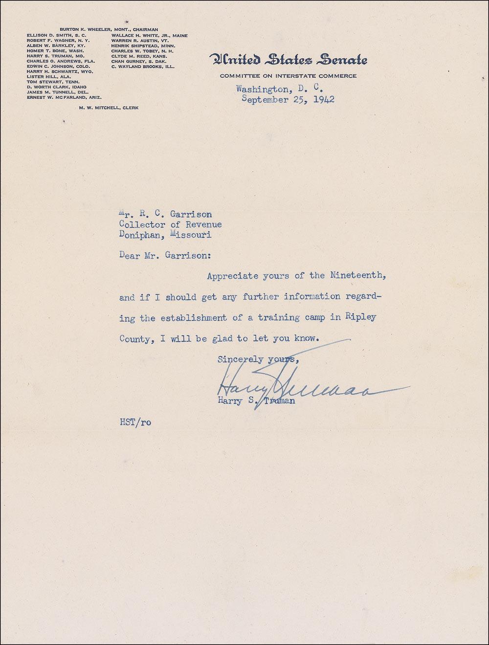 TLS, one page, 8 x 10.5, United States Senate letterhead, September 25, 1942. Truman contacts the collector of revenue in Doniphan, Missouri. In full: “Appreciate yours of the Nineteenth, and if I should get any further information regarding the establishment of a training camp in Ripley County, I will be glad to let you know.” Some creasing, scattered wrinkling, and a small spot of soiling near the bottom right corner, otherwise fine condition.