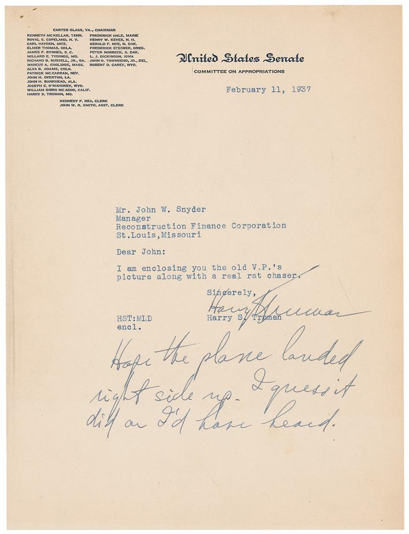 TLS, one page, 8 x 10.5, United States Senate letterhead, February 11, 1937. Short letter to John Snyder, Manager at Reconstruction Finance Corporation. In full: “I am enclosing you the old V.P’s picture along with a real rat chaser.” Under his signature, Truman adds a handwritten postscript, “Hope the plane landed right side up. I guess it did or I’d have heard.” In fine condition, with a uniform shade of toning and a bit of trivial foxing. Accompanied by a copy of a letter to Truman from Snyder, dated one day earlier, mentioning his harrowing air journey.
