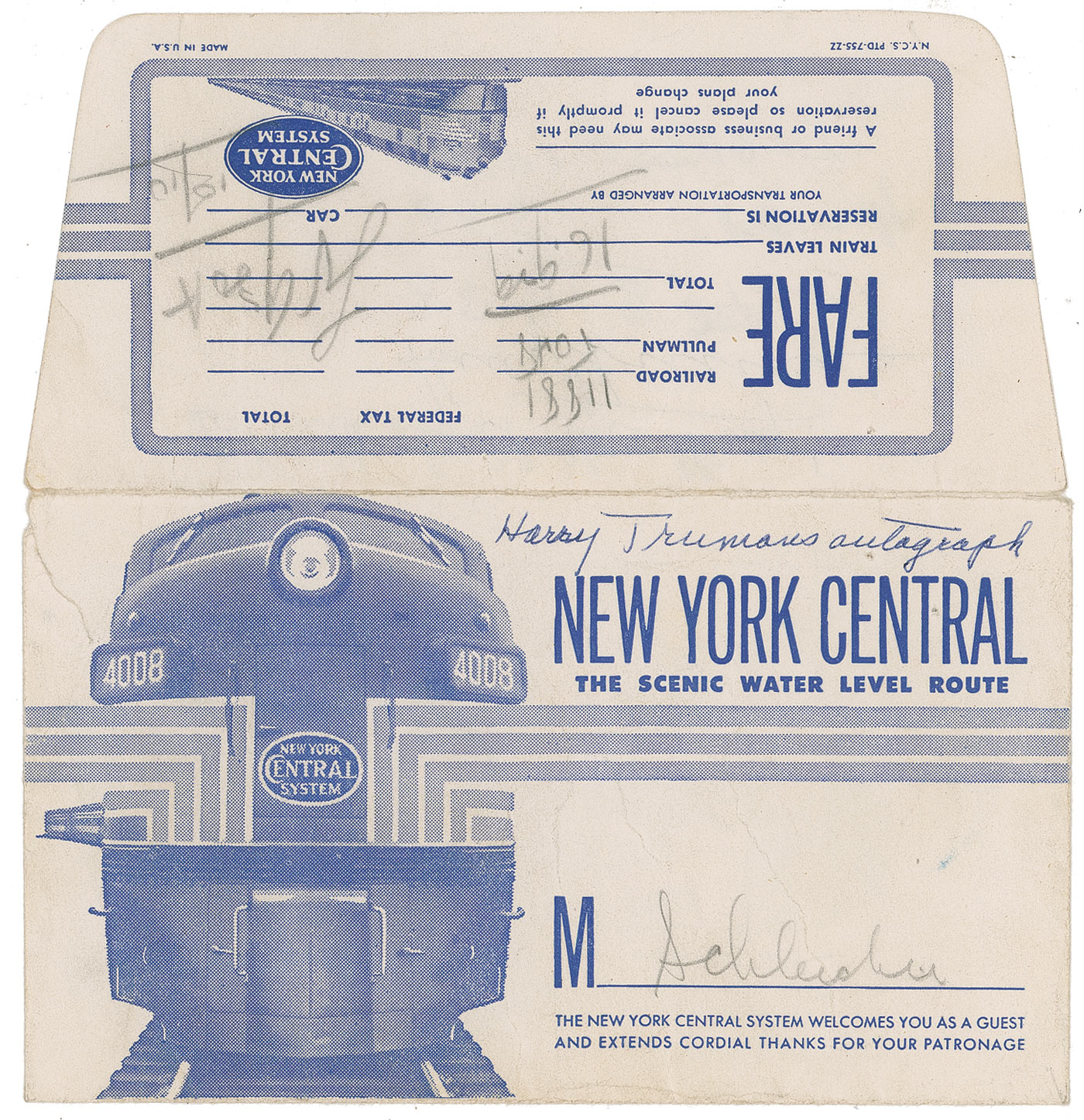 ANS, on the inside flap of a New York Central ticket envelope, measuring 6 x 6.5 opened, no date. Truman writes, “Let’s talk about this thing!” Pencil calculations under Truman’s note, with more notations on outside of envelope, expected handling wear, and scattered light toning and creasing, otherwise fine condition.