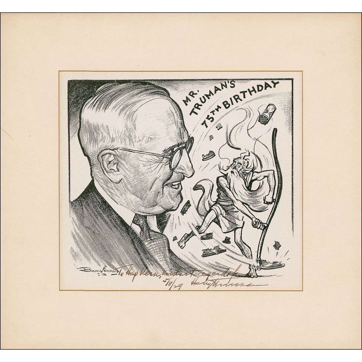 Printed vintage sketch of Truman celebrating his 75th birthday, laughing at Father Time, signed and inscribed in fountain pen at the bottom, “To Hap Kern, kindest regards from Harry Truman, 5/8/59,” on an off-white 8.75 x 8 sheet. In fine condition, with light toning around the edges and light contrast to the inscription.