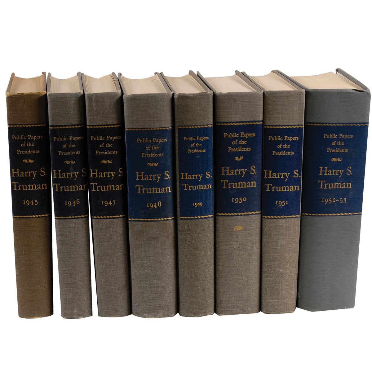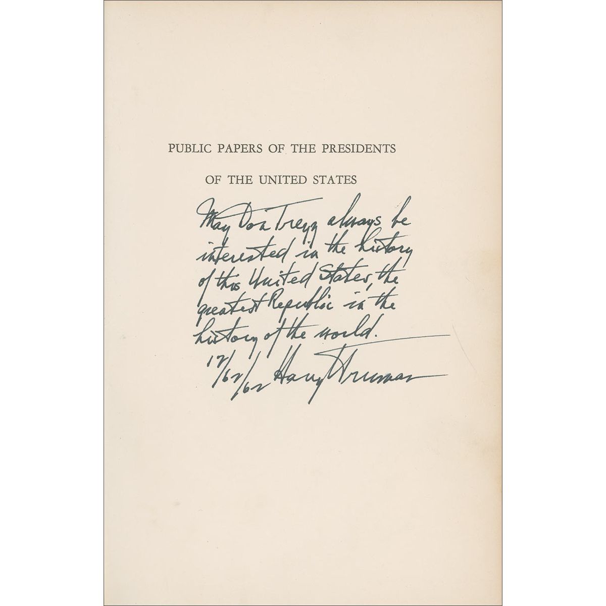 Signed book: Public Papers of the President, Harry S. Truman, eight volumes. Washington, D. C.: U. S. Government Printing, 1961. Hardcover, 7 x 10.25. Signed and inscribed in fountain pen on the half-title page of the 1945 Volume, “May Don Trezz always be interested in the history of the United States, the greatest Republic in the history of the world. 12/62/62 [sic] Harry Truman.” In fine condition, with some light sunning to pages, cover wear, and spines a bit loose. Profound words from the former chief executive. Oversized.