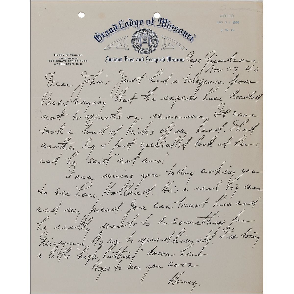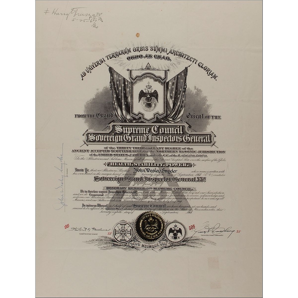ALS signed “Harry,” one page, 8.5 x 11, Grand Lodge of Missouri letterhead, November 27, 1940. Letter to John W. Snyder reads, in full: “Just had a telegram from Bess saying that the experts have decided not to operate on momma. It sure took a load of bricks off my head. I had another leg & foot specialist look at her and he said ‘not now.’ I am wiring you today asking you to see Lou Holland. He’s a real big man and my friend. You can trust him and he really wants to do something for Missouri. No ax to grind himself. I’m doing a little ‘high hatting’ down here. Hope to see you soon.”; and an ornate partly printed document, signed “John Wesley Snyder,” countersigned by the Sovereign Grand Commander 33° and Grand Secretary General 33° of the Supreme Council Sovereign Grand Inspectors General of the Thirty Third and Last Degree of the Ancient Accepted Scottish Rite for the Northern Masonic Jurisdiction of the United States of America, 16 x 20.75, September 28, 1966. Signed in the upper left “Harry S. Truman 33° P G-M, 8-25-67 Mo.” In very good to fine condition, with punch holes and staple holes to top edge of letter, as well as an office stamp; and central horizontal fold to document, as well as some scattered light toning and soiling, and adhesive remnants to reverse. Truman became a Mason in 1909, ultimately being elected Grand Master of Missouri in 1940, and is considered to be the most active Mason of any president since George Washington.