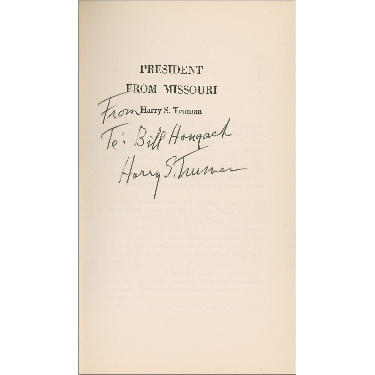 Signed book: President from Missouri. Later printing. NY: Julian Messner, 1965. Hardcover, 5.25 x 8.25, 191 pages. Signed and inscribed on the half-title page, “To: Bill Hongach, Harry S. Truman.” Some light toning to fore-edges, small label remnant to front pastedown, and light cover wear, otherwise fine condition.
