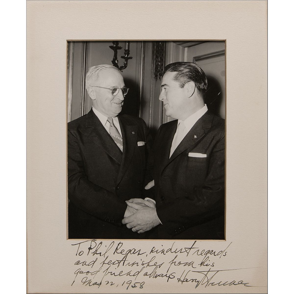 Vintage glossy 3.5 x 4.5 photo of Truman shaking hands with Irish tenor Phil Regan, matted to an overall size of 5.5 x 6.75, signed and inscribed in black ink on the mat “To Phil Regan, kindest regards and best wishes from his good friend always, Harry S. Truman Mar 22, 1958.” Some mild toning to edges of mat, and a paperclip impression to image, otherwise fine condition.