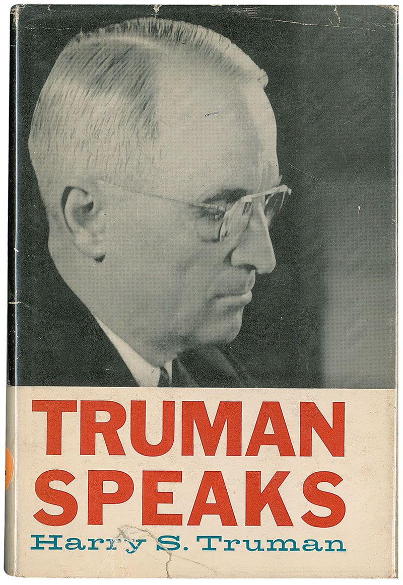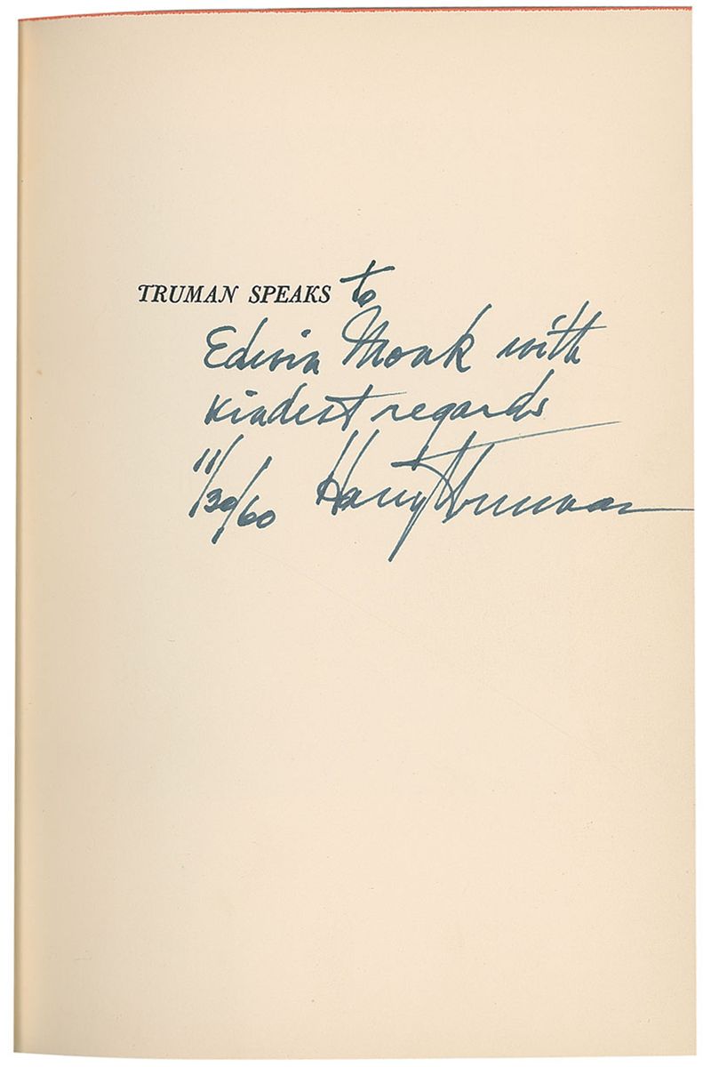 Signed book: Truman Speaks. First edition. NY: Columbia University Press, 1960. Hardcover with dustjacket, 5.75 x 8.25, 133 pages. Signed and inscribed on the half-title page, “To Edwin Monk with kindest regards, Harry S. Truman 11/30/60.” In fine condition, with a split to rear hinge and scattered light wear and edge tears to dustjacket.