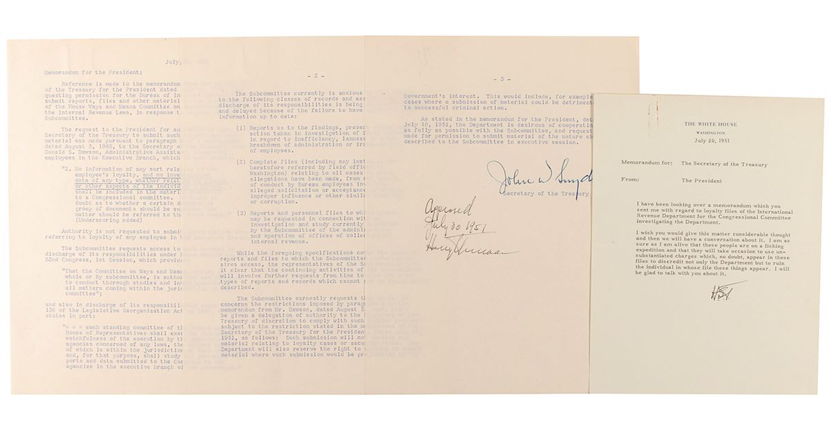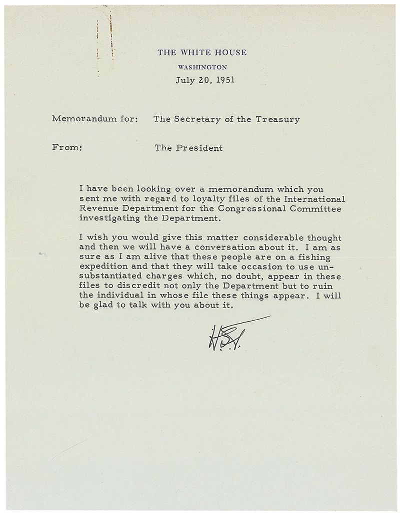 Two items: Typed memorandum, signed as president, “H.S.T,” one page, 6.75 x 8.75, White House letterhead, dated July 20, 1951. In full: “Memorandum for: The Secretary of the Treasury. From: The President. I have been looking over a memorandum which you sent me with regard to loyalty files of the International [sic, Internal] Revenue Department for the Congressional Committee investigating the Department. I wish you would give this matter considerable thought and then we will have a conversation about it. I am as sure as I am alive that these people are on a fishing expedition and that they will take occasion to use unsubstantiated charges which, no doubt, appear in these files to discredit not only the Department but to ruin the individual in whose file these things appear. I will be glad to talk with you about it.”