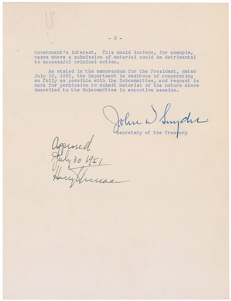 Also, a handwritten endorsement as president, “Approved, July 20, 1951, Harry S. Truman,” on the last page of a three-page typed memorandum from Treasury Secretary John Snyder, dated July 30, 1951. Memo reads, in part: “Reference is made to the memorandum from the Secretary of the Treasury for the President dated July 18, 1951, requesting permission for the Bureau of Internal Revenue to submit reports, files and other material to the Subcommittee of the House Ways and Means Committee on Administration of the Internal Revenue Laws, in response to a request of that Subcommittee. The request to the President for authority to the Secretary of the Treasury to submit such reports and other material was made pursuant to paragraph 2 of a memorandum, dated August 5, 1948, to the Secretary of the Treasury from Donald S. Dawson, Administrative Assistant, concerning employees in the Executive Branch, which in part states: ‘2. No information of any sort relating to the employee’s loyalty, and no investigative data of any type, whether relating to loyalty or other aspects of the individual’s record, shall be included in the material submitted to a Congressional committee. If there is doubt as to whether a certain document or group of documents should be supplied, the matter should be referred to the White House.’ Authority is not requested to submit investigative data referring to loyalty of an employee in the Executive Branch.” Senator Joseph McCarthy, who led the anti-Communism rally, called Truman’s refusal to allow access to all files ‘arrogant’ and a threat to national security. In fine condition, with rusty paperclip mark to Truman’s memo, and paperclip impression and light creases to endorsed memo.