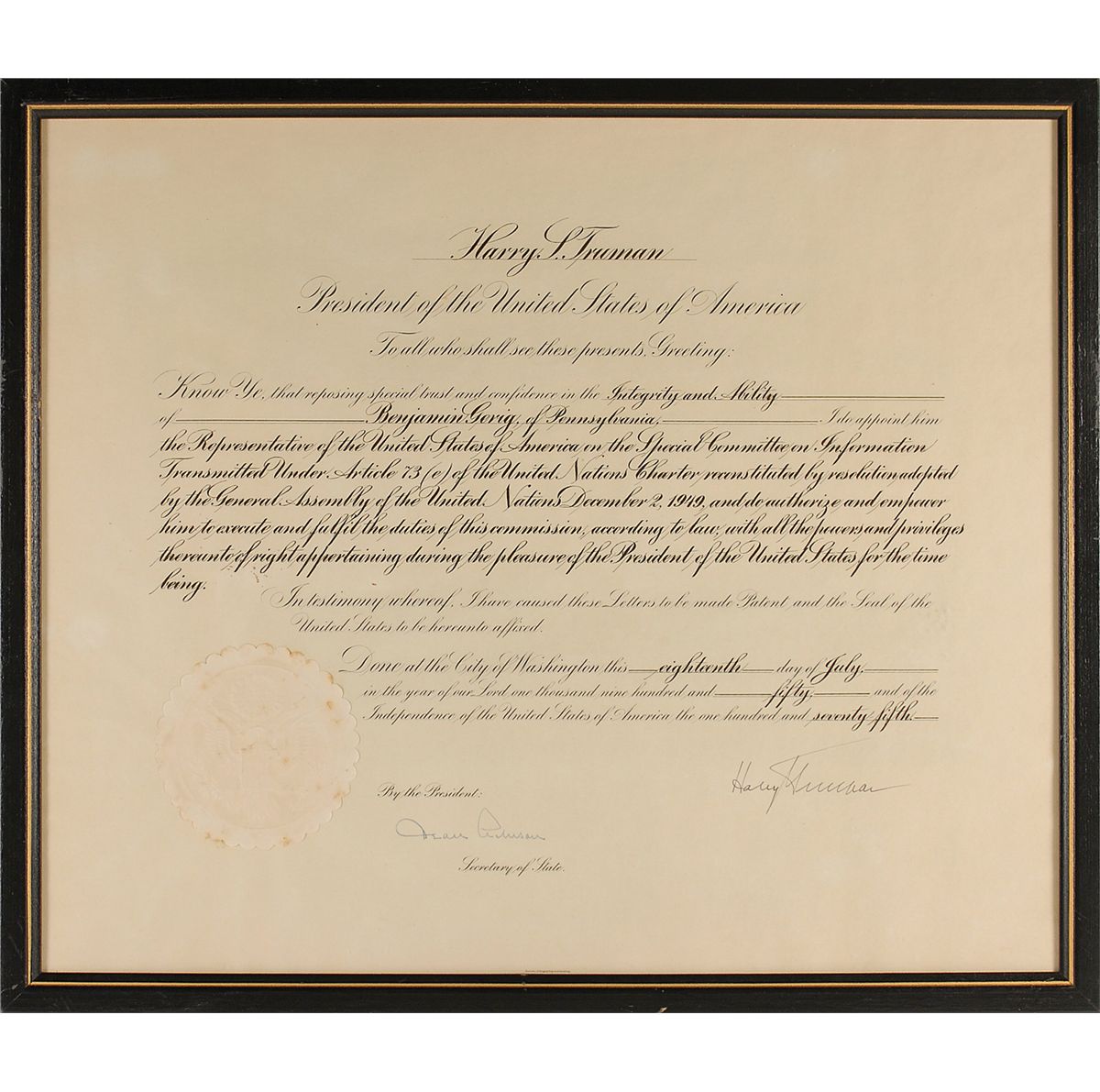 Partly-printed DS as president, one page, 18.5 x 15.5, July 18, 1950. President Truman appoints Benjamin Gerig of Pennsylvania “the Representative of the United States of America on the Special Committee on Information Transmitted Under Article 73 (e) of the United Nations Charter.” Signed at the conclusion by Truman and countersigned by Secretary of State Dean Acheson. Framed to an overall size of 20 x 17. In fine condition, with some scattered mild toning, primarily to the crisp, intact seal.