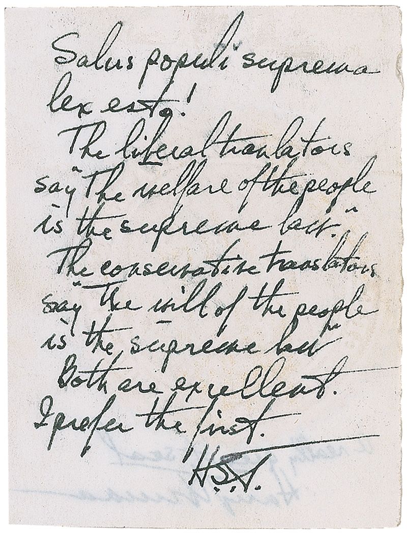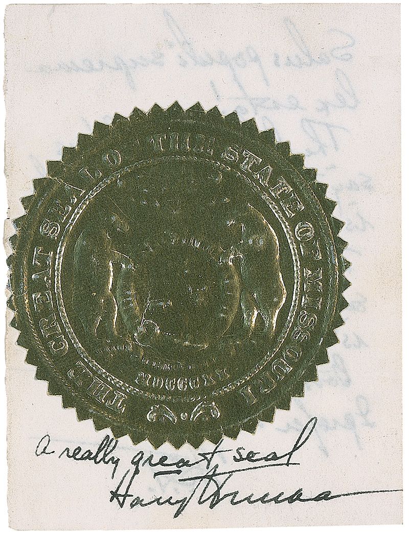 ANS signed “H. S. T.,” one page, 2.75 x 3.75, no date. Interesting note on both sides of an off-white slip, with a gold foil seal of the state of Missouri affixed to the reverse. In full: “Salus populi suprema lex esto! The liberal translators say ‘The welfare of the people is the supreme law.’ The conservative translators say ‘The will of the people is the supreme law.’ Both are excellent. I prefer the first.” On the reverse, under the seal, Truman adds, “A really great seal. Harry S. Truman.” In fine condition, with a touch of trivial soiling and impression of seal under text.