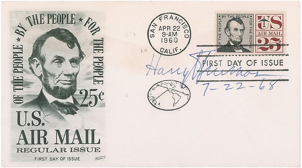 FDC with a cachet honoring Abraham Lincoln, signed in blue ballpoint, “Harry S. Truman, 7-22-68.” Some scattered mild toning and Truman’s signature over first day of issue stamp, otherwise fine condition.