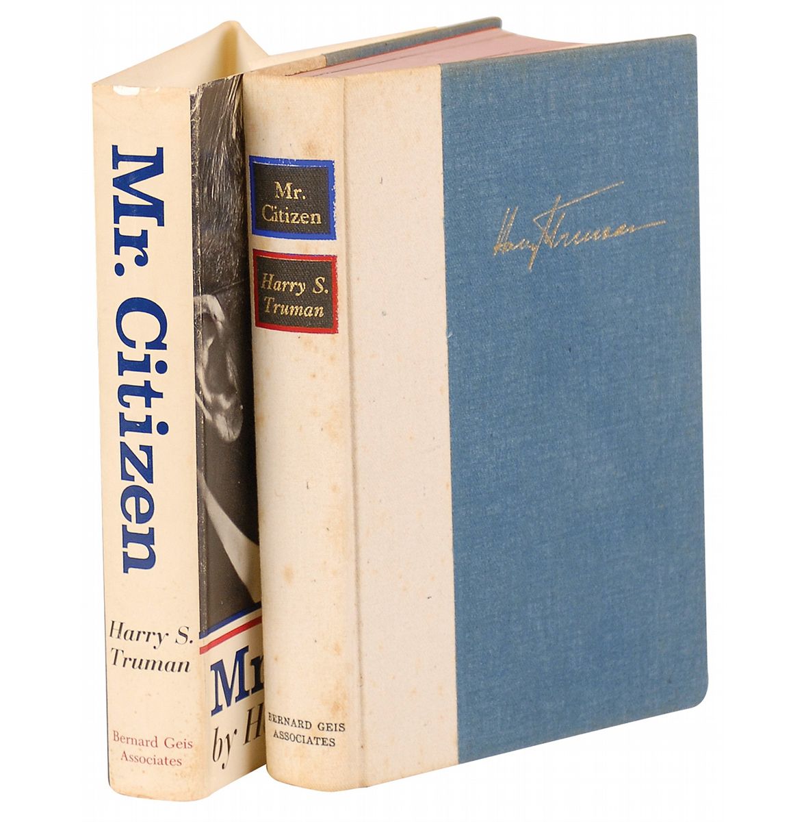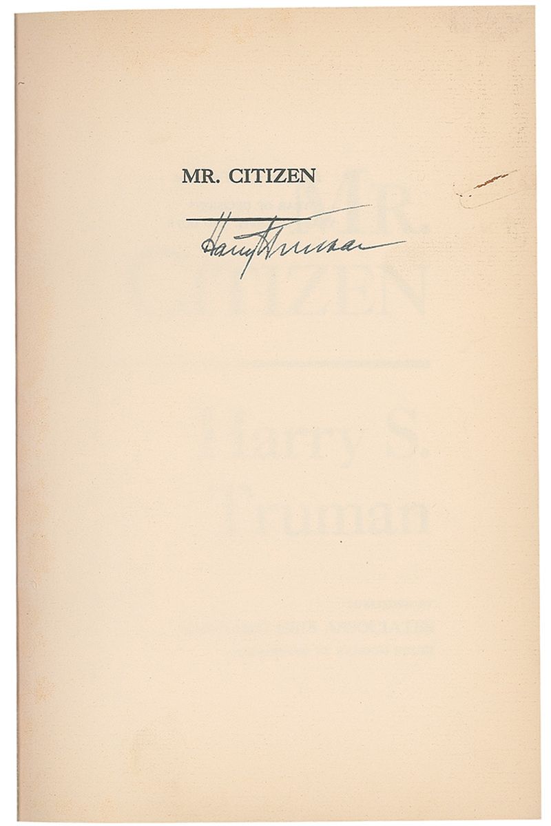 Signed book: Mr. Citizen. Later printing. NY: Bernard Geis, 1960. Hardcover with dustjacket, 6.25 x 9.25, 315 pages. Signed on the half-title page by Truman. Book condition: VG+/VG. Blue cloth-covered boards and white cloth-covered spine; foxing to white cloth and upper edges (few light scattered spots elsewhere); minor paperclip indentation to first 4 pages. Dust jacket has mild wear to edges (gentle creasing and few small tears); rubbing and light soiling; light foxing along spine and folds.