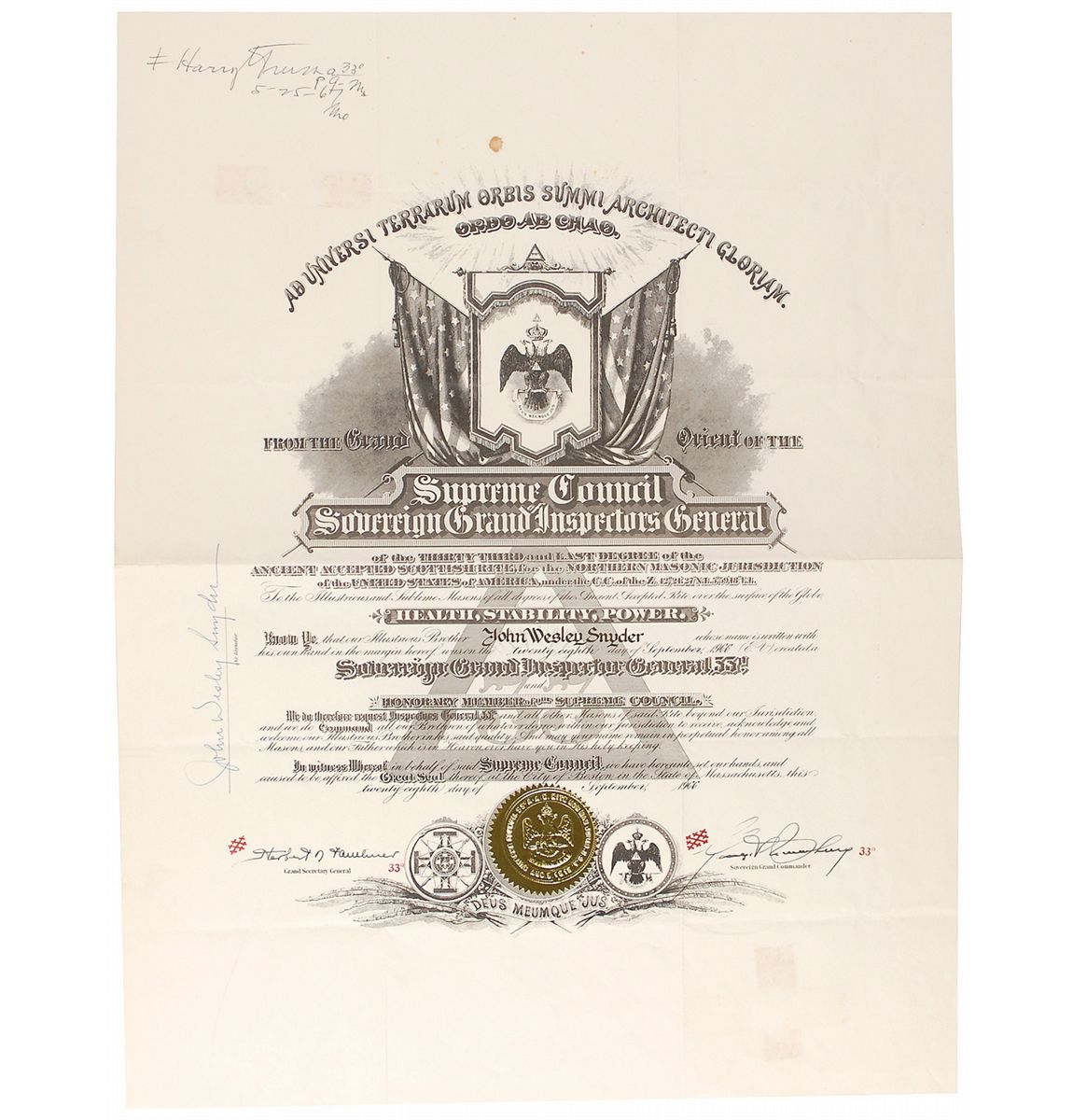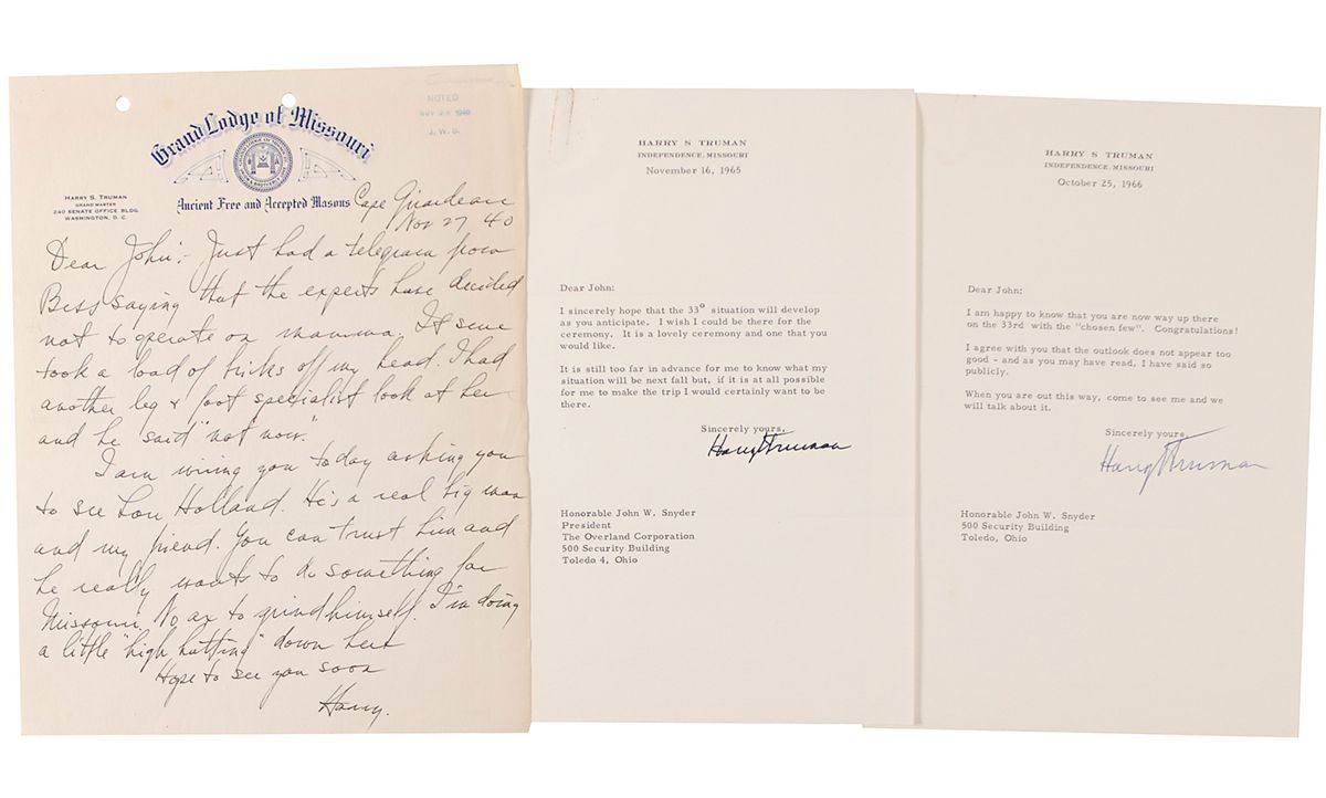 ALS signed “Harry,” one page, 8.5 x 11, Grand Lodge of Missouri letterhead, November 27, 1940. Letter to John W. Snyder reads, in full: “Just had a telegram from Bess saying that the experts have decided not to operate on Momma. It sure took a load of bricks off my head. I had another leg & foot specialist look at her and he said ‘not now.’ I am wiring you today asking you to see Lou Holland. He’s a real big man and my friend. You can trust him and he really wants to do something for Missouri. No ax to grind himself. I’m doing a little ‘high hatting’ down here. Hope to see you soon.”; and an ornate partly printed document, signed “John Wesley Snyder,” countersigned by the Sovereign Grand Commander 33° and Grand Secretary General 33° of the Supreme Council Sovereign Grand Inspectors General of the Thirty Third and Last Degree of the Ancient Accepted Scottish Rite for the Northern Masonic Jurisdiction of the United States of America, 16 x 20.75, September 28, 1966. Signed in the upper left “Harry S. Truman 33° P G-M, 8-25-67 Mo.” In very good to fine condition, with punch holes and staple holes to top edge of letter, as well as an office stamp; and central horizontal fold to document, as well as some scattered light toning and soiling, and adhesive remnants to reverse. Accompanied by two TLSs to Snyder, both signed by Truman, regarding Snyder’s Masonic situation.