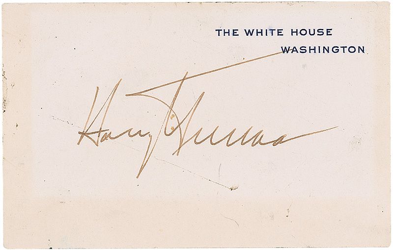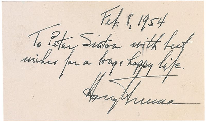 Two items: White House card, signed in black ink, “Harry S. Truman”; and an ink signature and inscription, “To Peter Sintoa with best wishes for a long & happy life. Harry S. Truman,” dated February 8, 1954, on an off-white 5 x 3 card. In very good condition, with toning to White House card and some light soiling and a few brushes to Truman’s inscription.